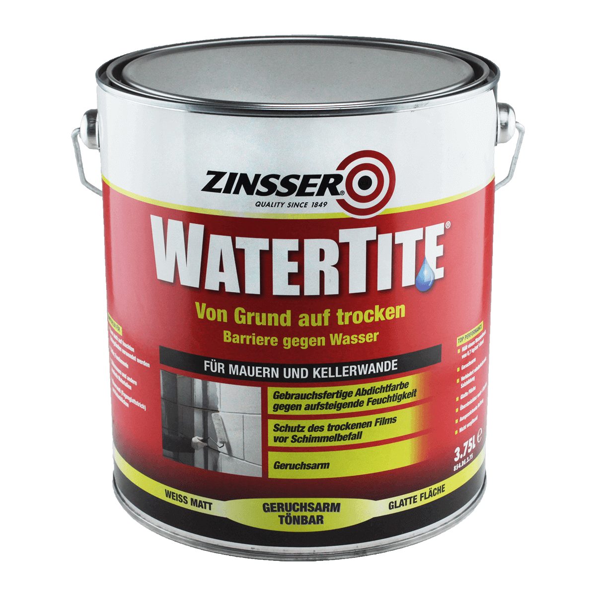 Zinsser Watertite ist eine gebrauchsfertige Wasserdichtungsfarbe, Sie verhindert die Wasserdurchsickerung durch Mauerwerk, Beton, Zement und Kellerwände. Die Abdichtfarbe kann zudem als Zweischichtsystem verwendet werden, als Grundierung um den Untergrund zu versiegeln, und die zweite Schicht schützt effektiv vor Wasserdurchsickerung und bildet einen Schutzfilm gegen Schimmelbefall.