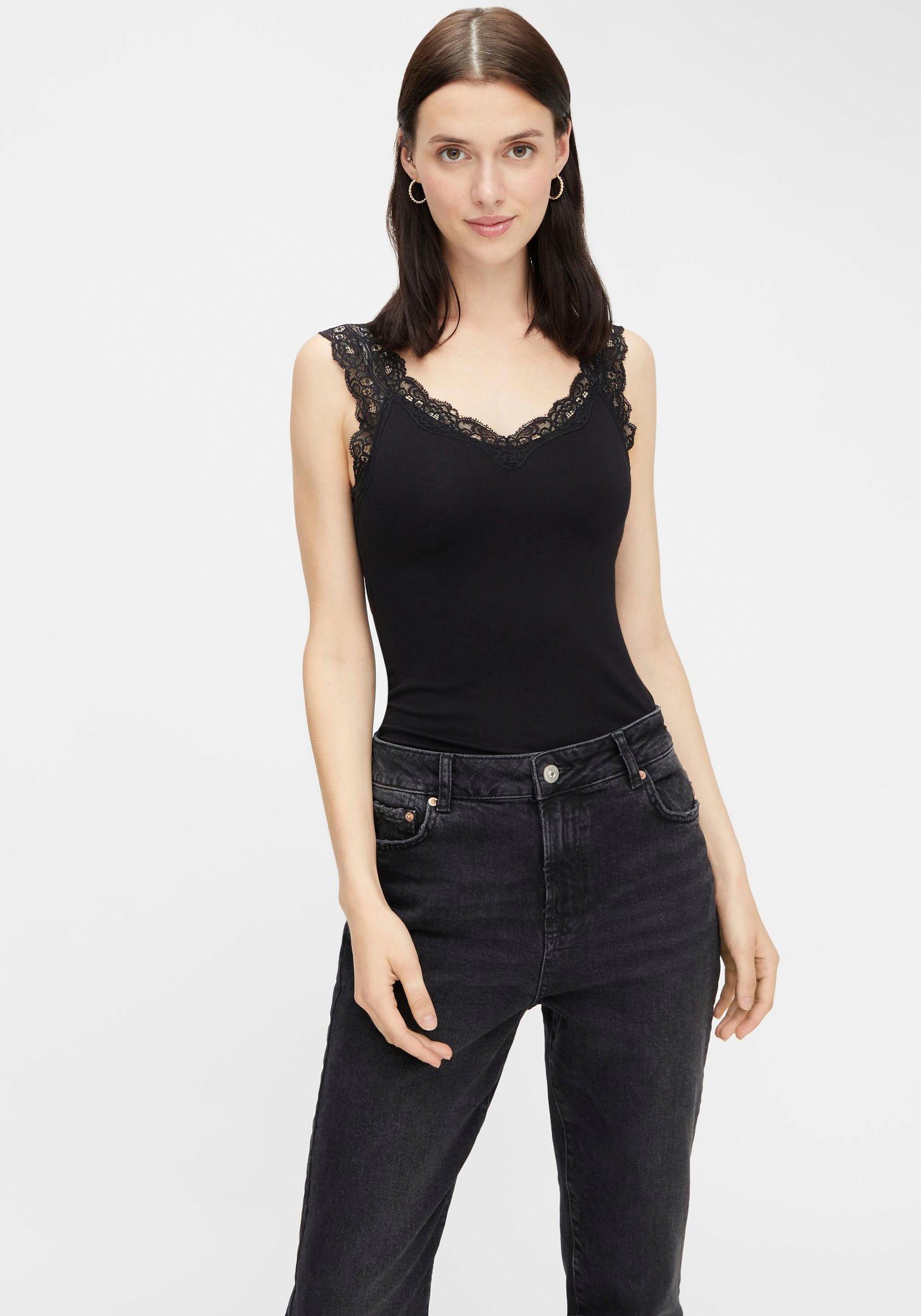 Gesucht und gefunden: Schau dir das Spitzentop »PCBARBERA« von pieces mal genauer an. Dieses Top hat einen V-Ausschnitt und ist hüftlang sowie tailliert geschnitten, sodass deine Silhouette schön zur Geltung kommt.