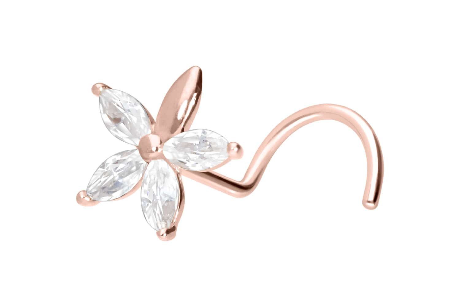 Dieser Nasenstecker mit dem Design in Form einer Blume besteht mit Ausnahme der Moissanite vollständig aus hochwertigem 14 Karat (585er) oder 18 Karat (750er) Gold, das neben seiner exzellenten Qualität auch mit Eigenschaften wie guter Hautverträglichkeit und hoher Beständigkeit zu begeistern weiß. Farblich ist er in Gelbgold, Roségold und rhodiniertem Weißgold erhältlich. Der Moissanit verleiht dem Schmuckstück seinen außergewöhnlichen, diamantenähnlichen Glanz. Jeder Einzelne unserer Artikel aus Gold wird mit viel Liebe zum Detail in Handarbeit gefertigt und ist somit ein Unikat. Dank des spiralförmigen Stabes dieses Schmuckstücks wird ein besonders fester Halt in der Nase gewährleistet. Es verfügt stets über eine Stabstärke von 0,6 mm, wohingegen die Stablänge 6 mm beträgt.