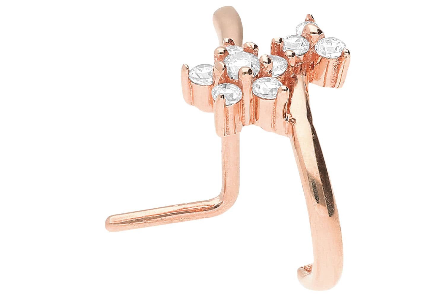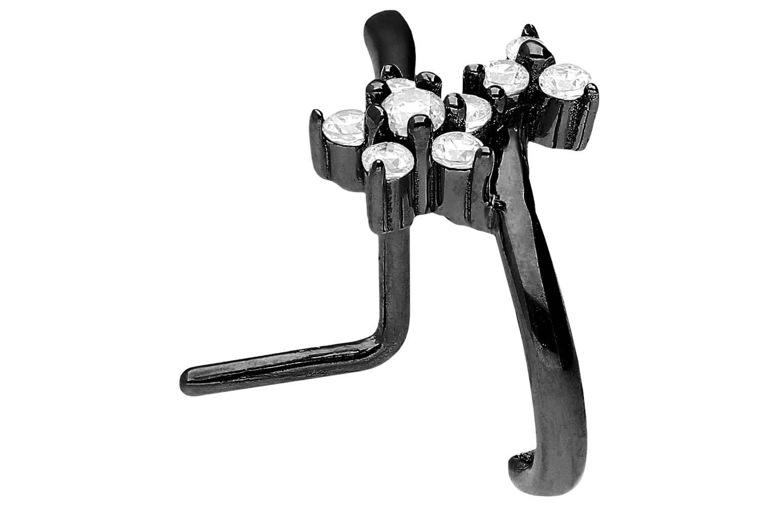 Dieses Schmuckstück vereint einen üblichen Nasenstecker mit einem Nasenring! Es ist aus Chirurgenstahl 316L gefertigt und sticht mit seinem eleganten Design hervor. Dank des L-förmigen Stabes ist ein guter Halt in der Nase gewährleistet und das Design, welches sich außerhalb der Nase befindet, erinnert durch seine Form an einen geschlossenen Nasenring. Das Design ist eine filigrane Kristallblume, die die Nase edel schmückt und zu einem Hingucker macht. Das verwendete Material zeichnet sich durch seine besonderen Eigenschaften wie Farbechtheit und Materialbeständigkeit aus. Dieses Piercing ist wahlweise mit einer farbigen PVD-Beschichtung versehen.