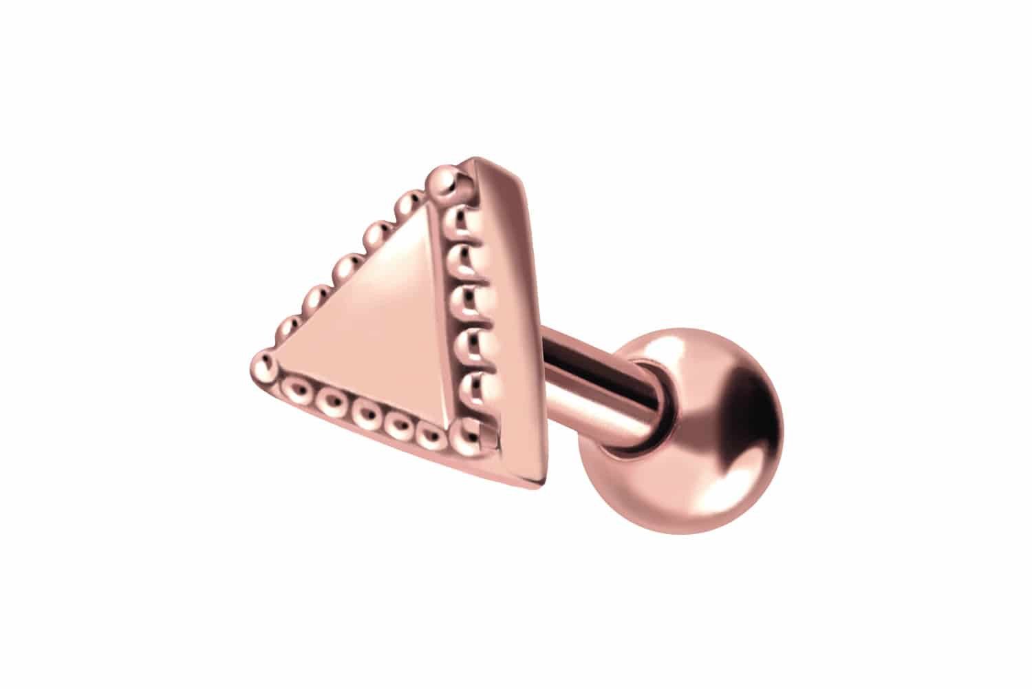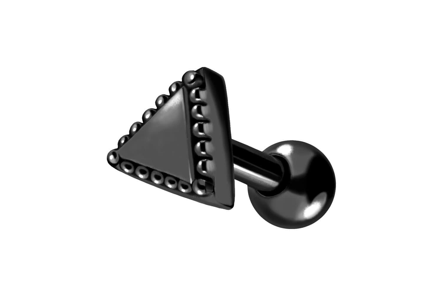 Dieses atemberaubend schöne Ohrpiercing besteht aus hochwertigem Chirurgenstahl 316L, der bekanntermaßen über Materialeigenschaften wie ebene Beschaffenheit und hohe Beständigkeit verfügt. Im Falle der schwarzen, gold- und roségoldfarbenen Варианты ist er mit einer kratzfesten PVD-Beschichtung überzogen. Seinen einzigartigen Charme erhält das Schmuckstück aufgrund des schlichten Designs in Form eines Dreiecks, umgeben von einigen Kugeln. Erhältlich ist es mit einer Stabstärke von 1,2 mm und einer Stablänge von 6 mm.