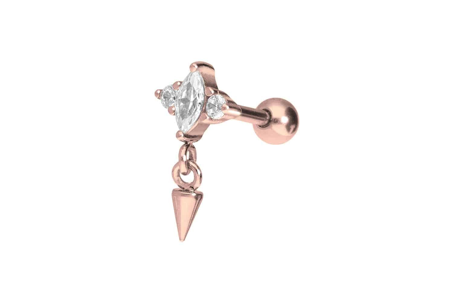 Dieses atemberaubend schöne Ohrpiercing besteht aus hochwertigem Chirurgenstahl 316L, der bekanntermaßen über Materialeigenschaften wie ebene Beschaffenheit und hohe Beständigkeit verfügt. Im Falle der schwarzen, gold- und roségoldfarbenen Варианты ist er mit einer kratzfesten PVD-Beschichtung überzogen. Visuell überzeugt das Schmuckstück mithilfe der funkelnden Kristalle mit Fassungen, die zusätzlich mit einer Spitze verziert sind. Erhältlich ist das Ohrpiercing mit einer Stabstärke von 1,2 mm und einer Stablänge von 6 mm.