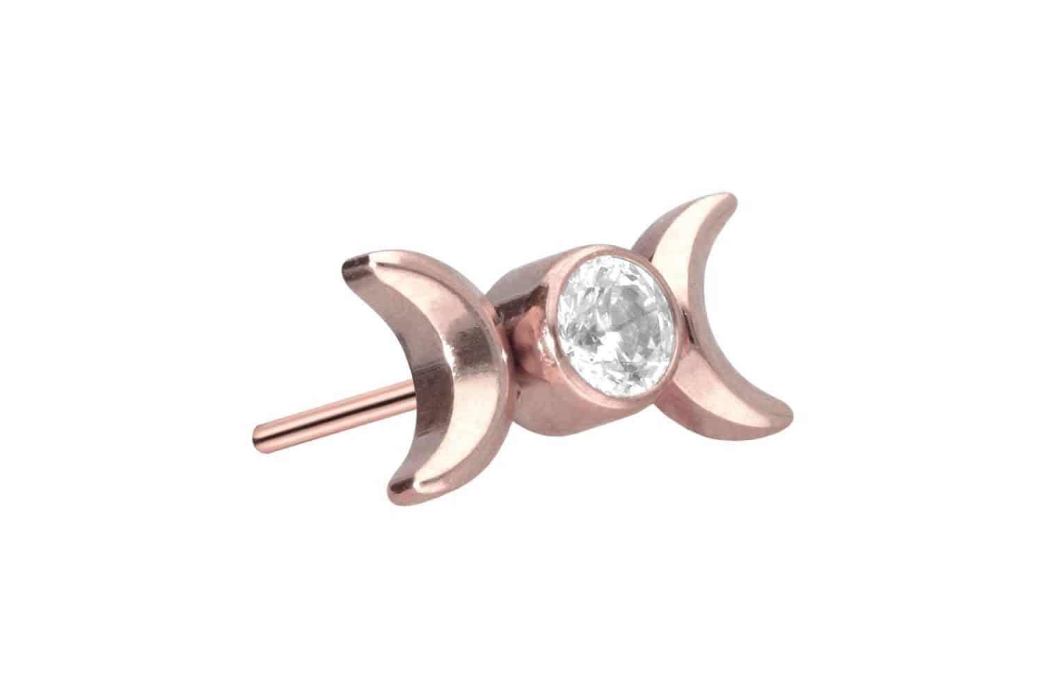 Dieser einzigartige Push Pin Aufsatz in Form von zwei Monden, welche durch einen funkelnden Kristall verbunden sind, wurde speziell für unsere Push Fit Piercings entwickelt und besteht aus hochwertigem Titan, das sich unter anderem durch gute Hautverträglichkeit, Farbechtheit und hohe Beständigkeit auszeichnet. Ebenfalls zu seinen spezifischen Materialeigenschaften gehört Farbechtheit, die sowohl bei der silberfarbenen als auch bei der schwarzen, gold- und roségoldfarbenen Варианты mit PVD-Beschichtung gewährleistet wird. Zum Einsetzen muss der Pin nach Belieben gebogen werden. Es ist zu beachten, dass ein festerer Halt gewährleistet ist, wenn der Pin ein bisschen stärker gebogen wird. Darüber hinaus ist der Push Pin des Aufsatzes mit all unseren Push Fit Produkten kompatibel, sodass sich vielfältige Kombinationsmöglichkeiten ergeben.
