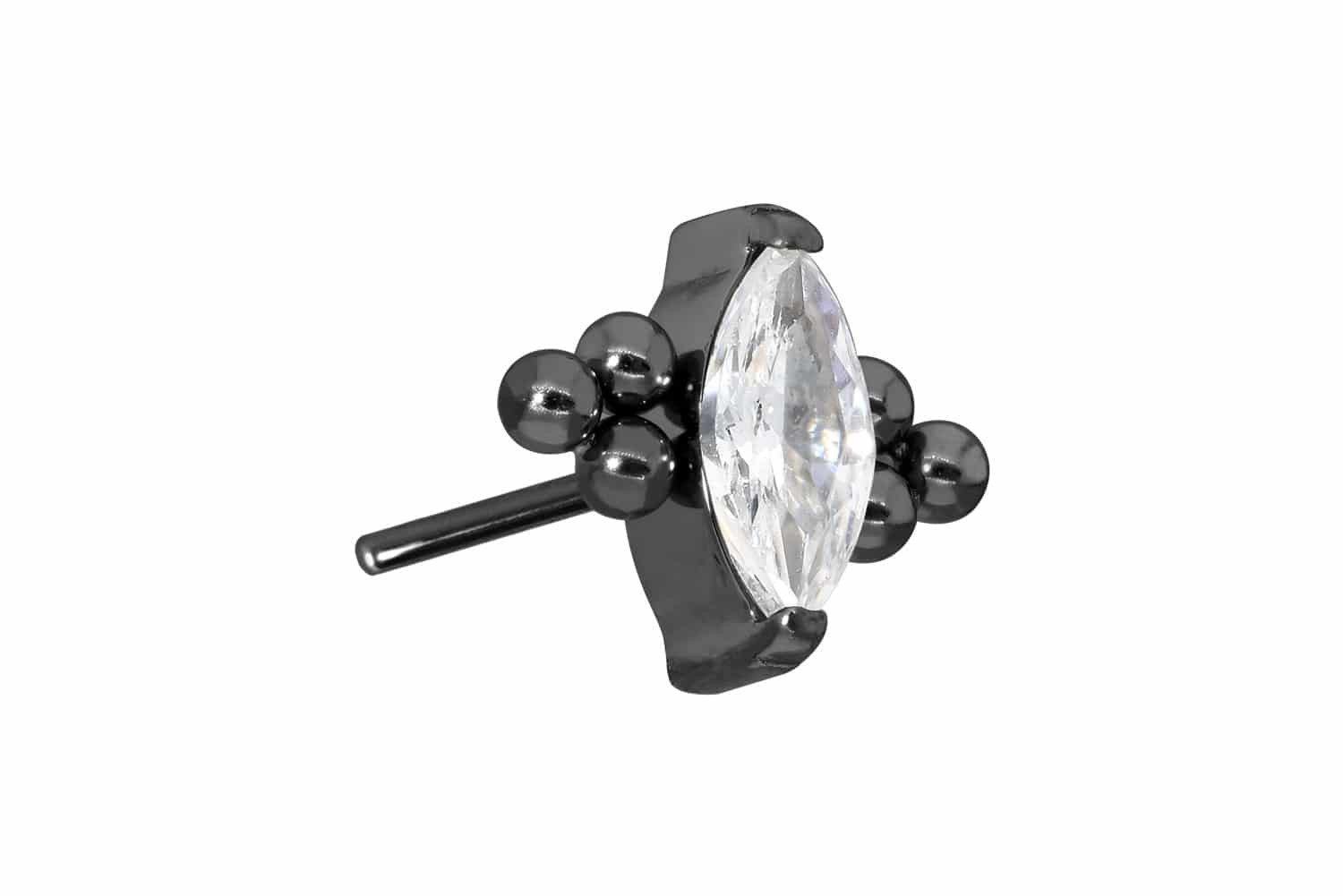 Dieser einzigartige Push Pin Aufsatz in Form eines Kristalltropfens, welcher mit mehreren Kugeln verziehrt ist, wurde speziell für unsere Push Fit Piercings entwickelt und besteht aus hochwertigem Titan, das sich unter anderem durch gute Hautverträglichkeit, Farbechtheit und hohe Beständigkeit auszeichnet. Ebenfalls zu seinen spezifischen Materialeigenschaften gehört Farbechtheit, die sowohl bei der silberfarbenen als auch bei der schwarzen, gold- und roségoldfarbenen Варианты mit PVD-Beschichtung gewährleistet wird. Zum Einsetzen muss der Pin nach Belieben gebogen werden. Es ist zu beachten, dass ein festerer Halt gewährleistet ist, wenn der Pin ein bisschen stärker gebogen wird. Darüber hinaus ist der Push Pin des Aufsatzes mit all unseren Push Fit Produkten kompatibel, sodass sich vielfältige Kombinationsmöglichkeiten ergeben.