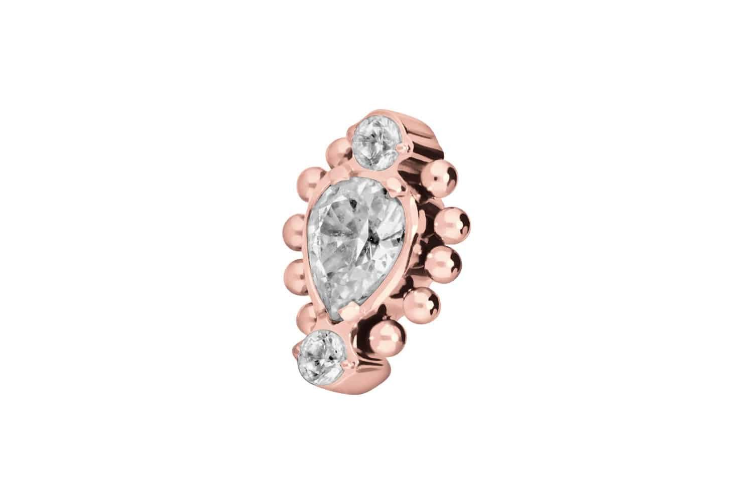 Dieser zeitlos schöne Schraubaufsatz in Form von drei funkelnden Kristallen, die von mehreren Kugeln umrahmt werden, wurde speziell für unsere Innengewinde-Piercings entwickelt. Seine Fassung besteht aus hochwertigem Titan, das sich unter anderem durch gute Hautverträglichkeit und hohe Beständigkeit auszeichnet. Ebenfalls zu dessen spezifischen Materialeigenschaften gehört Farbechtheit, die sowohl bei der silberfarbenen als auch bei der schwarzen, gold- und roségoldfarbenen Варианты mit PVD-Beschichtung gewährleistet wird. Das 0,9 mm starke Außengewinde des Aufsatzes ist mit all unseren Produkten, die über ein solches Innengewinde verfügen, kompatibel, sodass sich vielfältige Kombinationsmöglichkeiten ergeben.