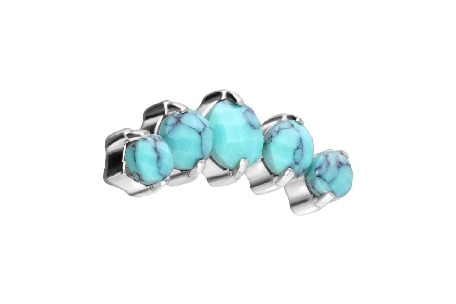 Dieser zeitlos schöne Schraubaufsatz in Fom von fünf synthetischen Türkisen wurde speziell für unsere Innengewinde-Piercings entwickelt und besteht aus hochwertigem Titan, das sich unter anderem durch gute Hautverträglichkeit und hohe Beständigkeit auszeichnet. Ebenfalls zu seinen spezifischen Materialeigenschaften gehört Farbechtheit, die sowohl bei der silberfarbenen als auch bei der schwarzen, gold- und roségoldfarbenen Варианты mit PVD-Beschichtung gewährleistet wird. Das 0,9 mm starke Außengewinde des Aufsatzes ist mit all unseren Produkten, die über ein solches Innengewinde verfügen, kompatibel, sodass sich vielfältige Kombinationsmöglichkeiten ergeben.