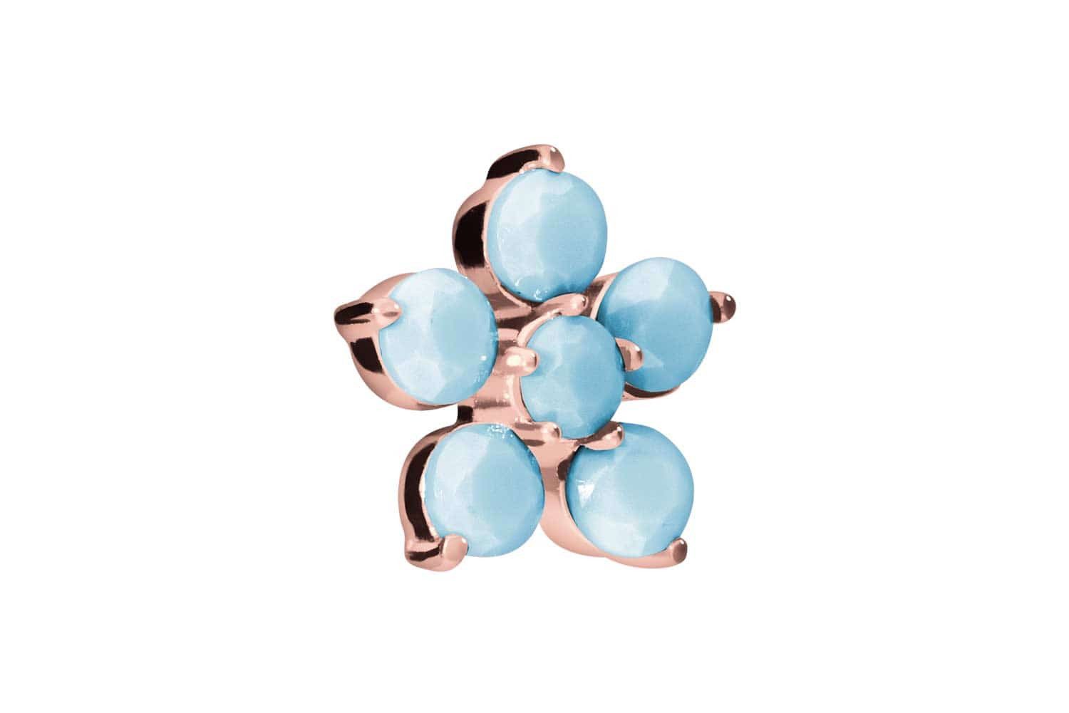 Dieser zeitlos schöne Schraubaufsatz in Form einer Blume, dessen Blätter aus synthetischen Türkisen bestehen, wurde speziell für unsere Innengewinde-Piercings entwickelt und besteht aus hochwertigem Titan, das sich unter anderem durch gute Hautverträglichkeit und hohe Beständigkeit auszeichnet. Ebenfalls zu seinen spezifischen Materialeigenschaften gehört Farbechtheit, die sowohl bei der silberfarbenen als auch bei der schwarzen, gold- und roségoldfarbenen Варианты mit PVD-Beschichtung gewährleistet wird. Das 0,9 mm starke Außengewinde des Aufsatzes ist mit all unseren Produkten, die über ein solches Innengewinde verfügen, kompatibel, sodass sich vielfältige Kombinationsmöglichkeiten ergeben.