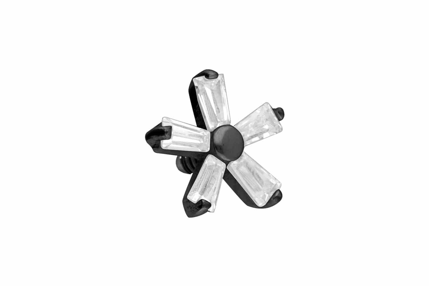 Dieser zeitlos schöne Schraubaufsatz in Form einer Blume mit funkelnden Kristallen wurde speziell für unsere Innengewinde-Piercings entwickelt und besteht aus hochwertigem Titan, das sich unter anderem durch gute Hautverträglichkeit und hohe Beständigkeit auszeichnet. Ebenfalls zu seinen spezifischen Materialeigenschaften gehört Farbechtheit, die sowohl bei der silberfarbenen als auch bei der schwarzen, gold- und roségoldfarbenen Варианты mit PVD-Beschichtung gewährleistet wird. Das 0,9 mm starke Außengewinde der Schraubdisc ist mit all unseren Produkten, die über ein solches Innengewinde verfügen, kompatibel, sodass sich vielfältige Kombinationsmöglichkeiten ergeben.