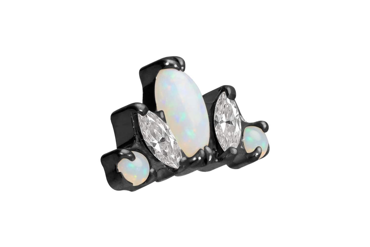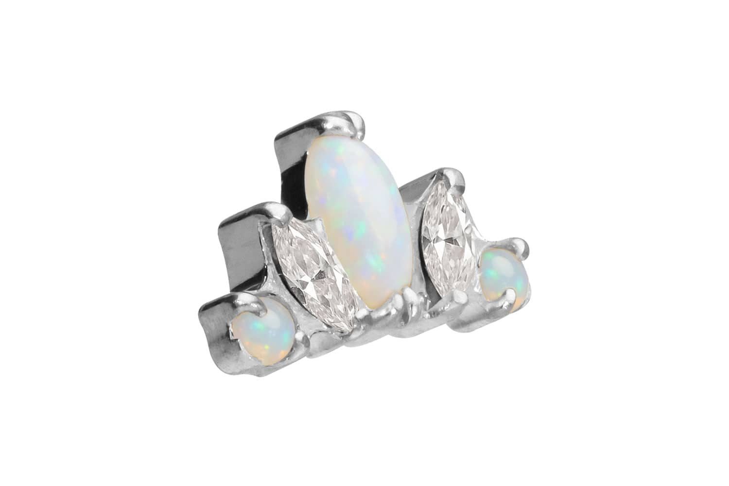 Dieser zeitlos schöne Schraubaufsatz in Form einer Lotusblüte, die sich aus mehreren funkelnden Kristallen und synthetischen Opalen zusammensetzt, wurde speziell für unsere Innengewinde-Piercings entwickelt und besteht aus hochwertigem Titan, das sich unter anderem durch gute Hautverträglichkeit und hohe Beständigkeit auszeichnet. Ebenfalls zu seinen spezifischen Materialeigenschaften gehört Farbechtheit, die sowohl bei der silberfarbenen als auch bei der schwarzen, gold- und roségoldfarbenen Варианты mit PVD-Beschichtung gewährleistet wird. Das 0,9 mm starke Außengewinde der Schraubdisc ist mit all unseren Produkten, die über ein solches Innengewinde verfügen, kompatibel, sodass sich vielfältige Kombinationsmöglichkeiten ergeben.