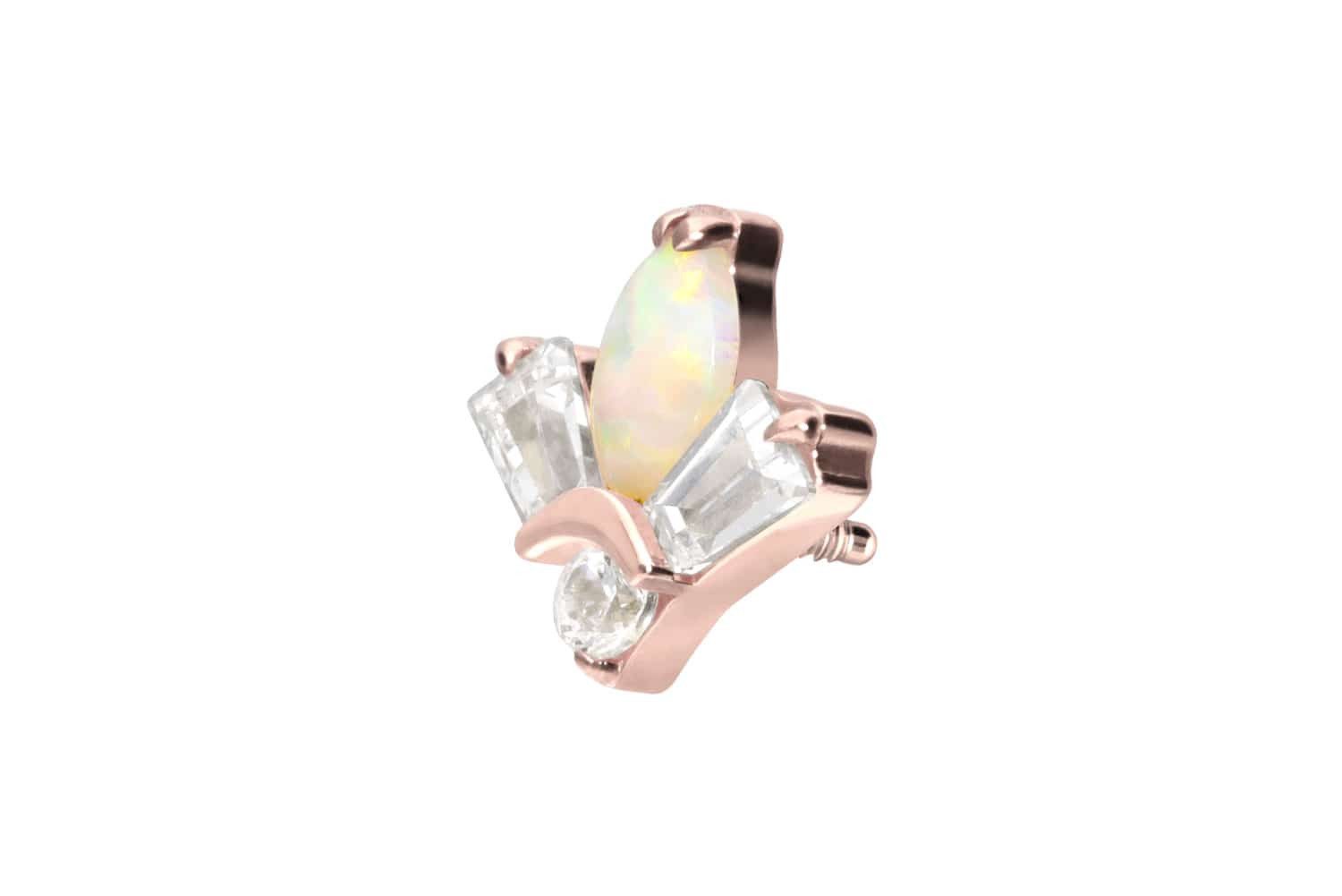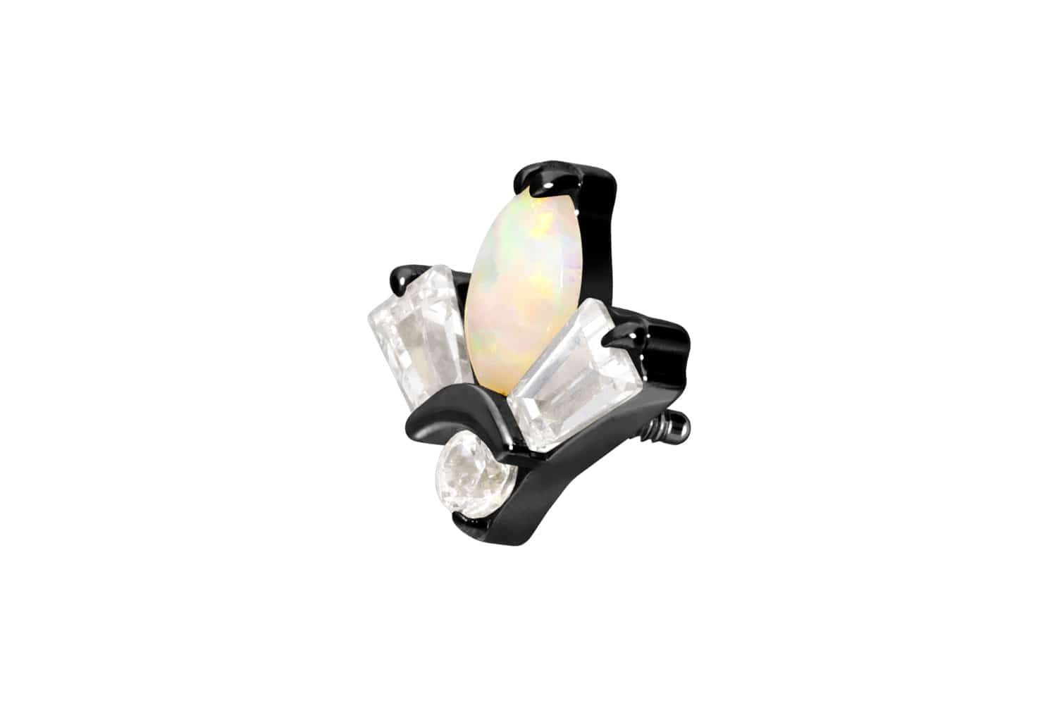Dieser zeitlos schöne Schraubaufsatz in Form einer Lotusblüte, die sich aus mehreren funkelnden Kristallen und einem synthetischen Opal zusammensetzt, wurde speziell für unsere Innengewinde-Piercings entwickelt und besteht aus hochwertigem Titan, das sich unter anderem durch gute Hautverträglichkeit und hohe Beständigkeit auszeichnet. Ebenfalls zu seinen spezifischen Materialeigenschaften gehört Farbechtheit, die sowohl bei der silberfarbenen als auch bei der schwarzen, gold- und roségoldfarbenen Варианты mit PVD-Beschichtung gewährleistet wird. Das 0,9 mm starke Außengewinde der Schraubdisc ist mit all unseren Produkten, die über ein solches Innengewinde verfügen, kompatibel, sodass sich vielfältige Kombinationsmöglichkeiten ergeben.
