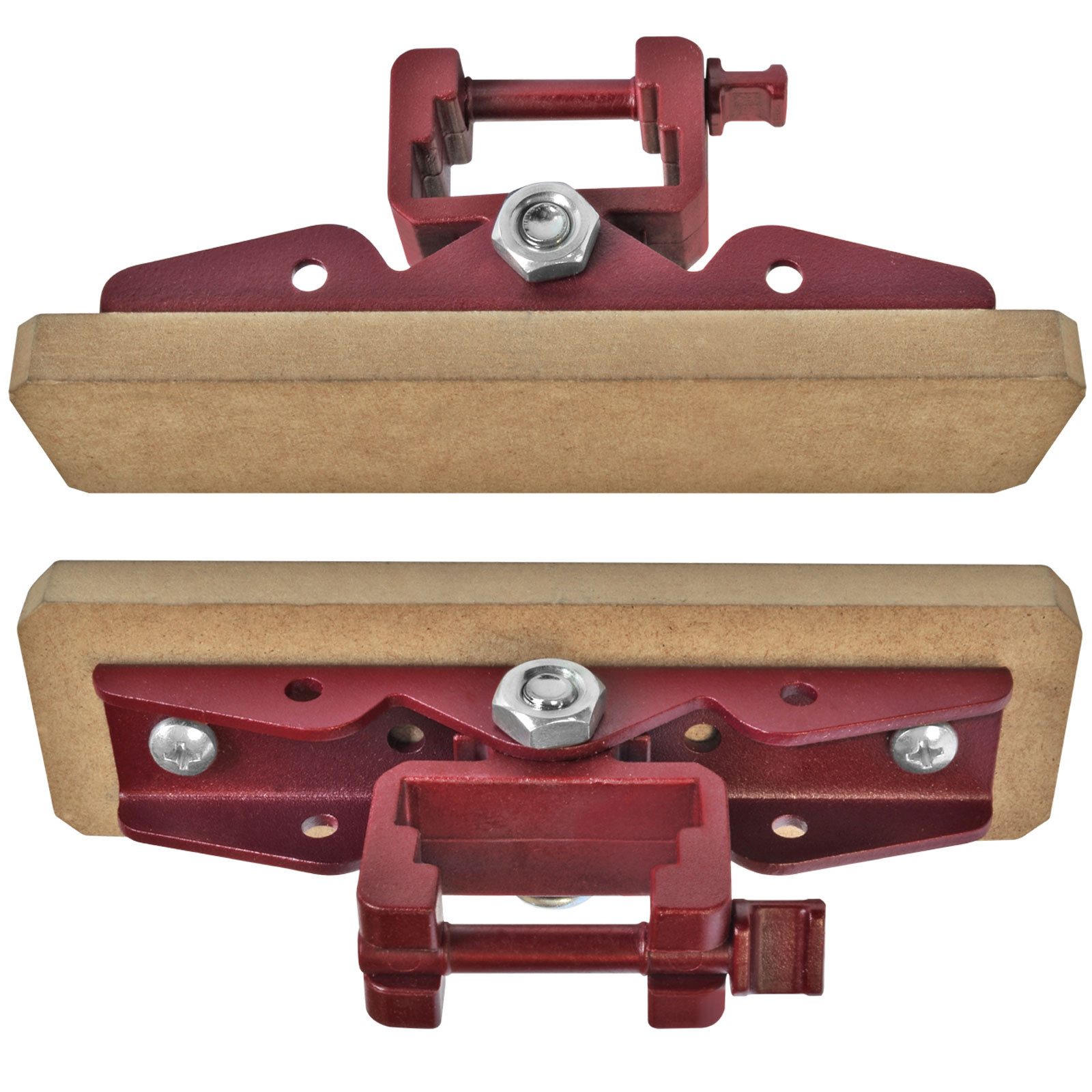 Die Aufsätze sind aus MDF gefertigt (40x140 mm) und werden ganz einfach auf die Spannbacken der PRL400 aufgesteckt. Sie können wahlweise sowohl geneigte und als auch parallele Flächen zur Bearbeitung einspannen. Ihre Werkstücke lassen sich so z.B. mühelos verleimen bzw. pressen. Die MDF-Platte, kann je nach Bedarf, durch individuelle Formen (Kurven, Dreiecke usw.) ersetzt werden. Somit ist immer die richtige Zwinge zur Hand.