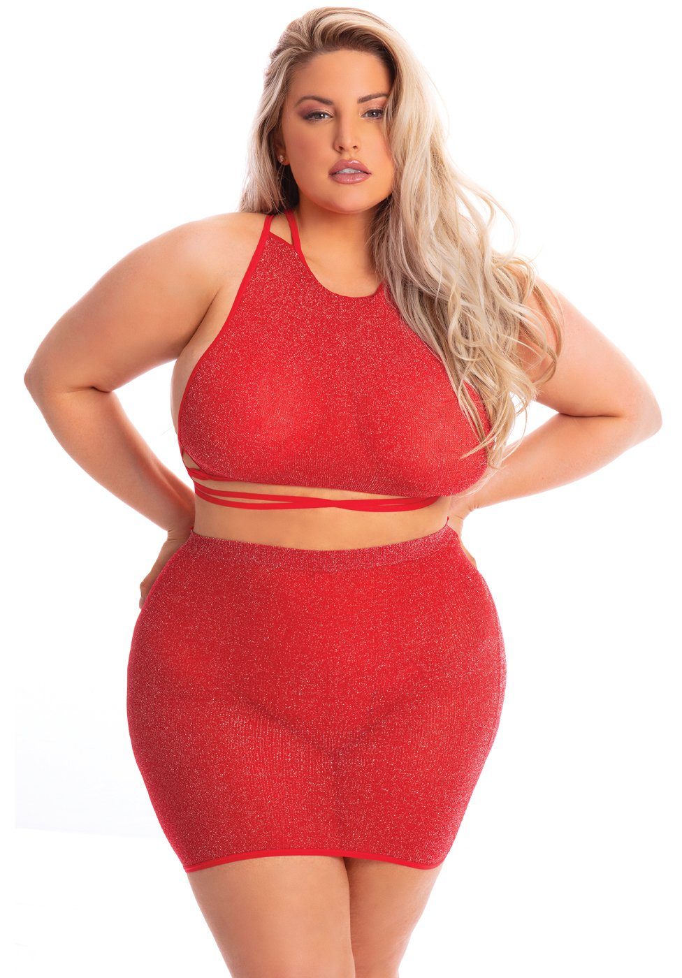 Midnight Sun ist ein 2-teiliges Set aus durchsichtigem Glitzerstoff, bestehend aus einem Rock und einem Crop-Top mit Bändern, die um die Taille gewickelt werden.