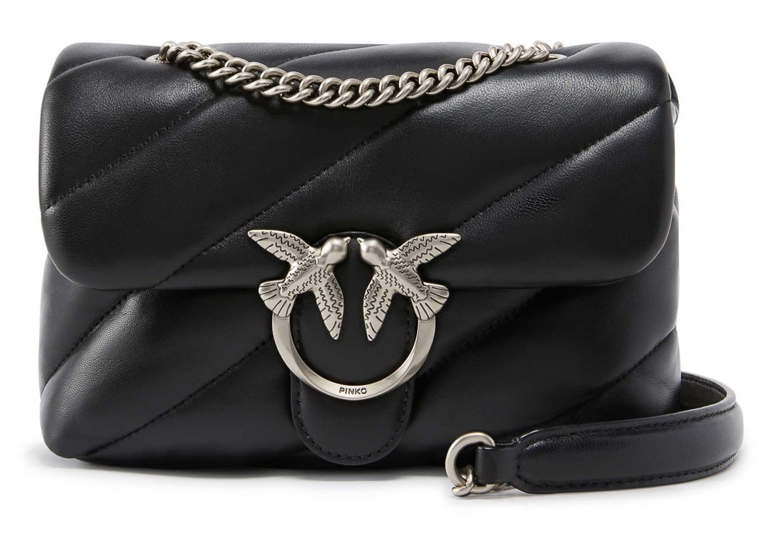 Elegante Umhängetasche von PINKO überzeugt durch sanftes Leder und edle Metall-Akzente. Das Hauptfach bietet genug Platz, um alles zu verwahren, was man im Alltag benötigt. Der Umhängeriemen mit Kettenverzierung verleiht der Tasche zusätzlich Eleganz und ein festliches Aussehen.