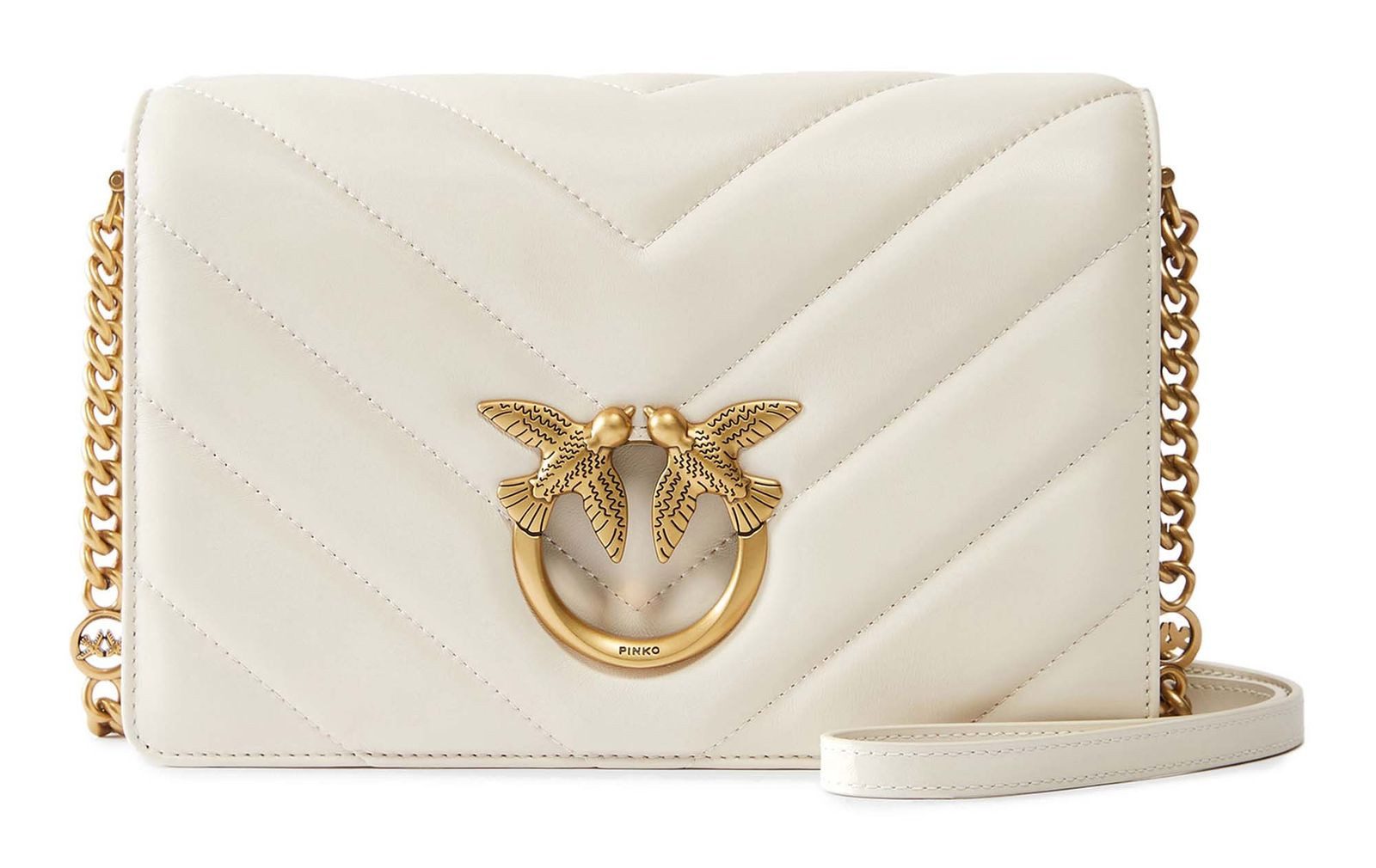 Eine Umhängetasche der Extraklasse! Die neue PINKO überzeugt mit ihrer eleganten und breit gesteppten Optik. Das Metall-Logo Love Birds setzt dieser eleganten Wirkung das Krönchen auf und rundet Ihr Styling so harmonisch ab. Die Tasche lässt sich am verstellbaren Schulterriemen vornehm tragen. Der Schulterriemen besteht aus einer Kombination aus einer Metallkette mit runden Gliedern mit Love Birds und einem praktischen verstellbaren Tragegurt aus Leder. Die Formgebung der Tasche wirkt zum einen modern, ist aber auch ungemein praktisch, denn so kann die Schultertasche von ganz alleine stehen. Für die nächste Verabredung zum Dinner oder für den Cocktailabend mit den Mädels ist die PINKO Love Click Classic Sheep Nappa Big Chevron M mehr als geeignet! Ein weiterer Pluspunkt bei dieser PINKO Tasche: Aktivieren Sie Ihre PINKO Tasche, indem Sie Ihr Smartphone an die Love Birds-Stickerei auf der Rückseite der Tasche halten, um die Echtheit Ihres Produkts zu überprüfen und für ein personalisiertes Erlebnis!
