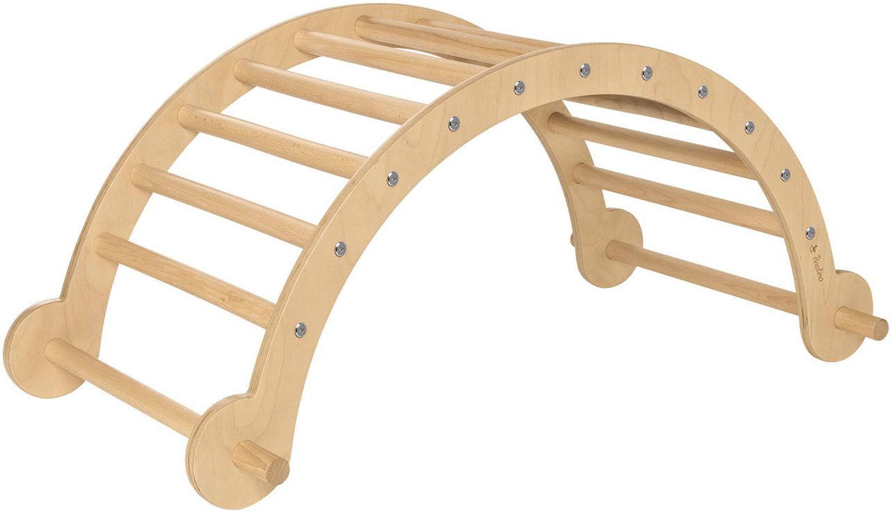 Pinolino Kletterbogen und Wippe »Kari« nach Pikler mit den Maßen: B 104 x T 60 x H 46 cm mit rutschfester Aufstellfläche und maximaler Belastbarkeit von 50 kg. Material aus 18mm Birkensperrholz und 30mm Buchensprossen. Montage erforderlich. Der Kletterbogen ist drehbar und somit auch als Wippe nutzbar. Die Aufstellfläche als Bogen ist rutschhemmend lackiert, was besondere Sicherheit mit sich bringt. Der Kreis am Ende des Bogens verhindert, dass die Wippe überschlagen kann. Ein zusätzliches Highlight ist, dass der Griff und der Sprossenabstand zum Boden so gestaltet ist, dass sich Kinder beim Festhalten nicht die Finger klemmen können. Dies ist besonders wichtig, damit gefahrenlos gespielt werden kann. Der Kletterbogen bzw. die Kletterwippe ist ein super Geschenk für Kinder ab 2 Jahren und ist optional erweiterbar durch ein Balanceboard, ein Kletterdreieck, einen Kletterwürfel und ein Kletterbrett.