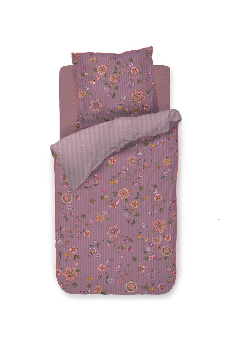 Der Bettbezug Flores Bailando von Pip Studio ergänzt Ihr Schlafzimmer mit einem opulenten, stilvollen Blumenmuster. Das Dessin zeigt elegante Zweige, an denen fantasievoll gestaltete Blüten wachsen. Wenn Sie den Bettbezug umschlagen, wird der auf der Rückseite ausgeführte, stilisierte Blätterprint sichtbar. Flores Bailando ist in mehreren Farben erhältlich. Der Bettbezug und die Kissenbezüge sind mit einem gesteppten Rand und einer beidseitig applizierten, runden Paspel versehen, die ihnen ein luxuriöses Finish verleiht. Die Kissenbezüge sind mit gepolsterten Knöpfen versehen, so dass Sie diese, ebenso wie den Bettbezug, als Wendebettwäsche verwenden können. Damit gelingt Ihnen ein verspielter, wohnlicher Mix-and-Match-Effekt.Die Bettwäsche ist aus fein gewebtem 100% Baumwollperkal hergestellt. Dank seiner hohen Fadendichte 200TC fühlt sich dieser Stoff fest und ""knackig"" an und ist weicher und feiner als normale Baumwolle. Die Bettwäsche ist außerdem sehr saugfähig und kühl. Dank des extra langen Einschlagstreifens über die gesamte Breite ist sie leicht zu verarbeiten. Der Bettbezug ist mit einem Reißverschluss ausgestattet. Die Bettwäsche ist bis 60 Grad waschbar, trocknergeeignet und kann gebügelt werden. Der Bettbezug ist in einem hübschen Stoffbeutel verpackt, der aus demselben Stoff wie der Bezug besteht. Der Beutel ist nicht nur wiederverwendbar, sondern ermöglicht es Ihnen auch den Druck des Bezugs zu sehen und zu fühlen. Pip Studio macht happy products for happy people. Pip Studio entwirft und produziert Bett-, Küchen- und Badtextilien in Zusammenarbeit mit Bedding House. Jedes Produkt ist ein echter Hingucker: klassisch, aber mit einem verspielten Twist."