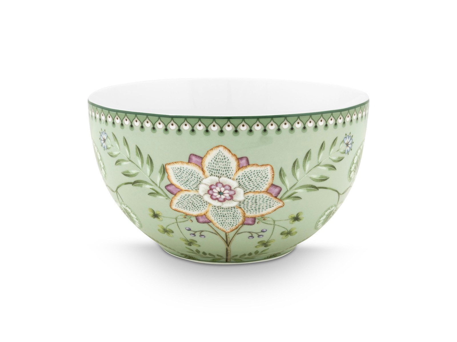 Die PIP STUDIO Lily & Lotus Light Green Bowl mit einem Durchmesser von 18 cm vereint tropische Eleganz mit praktischer Vielseitigkeit. Das florale Design, inspiriert von Lotusblumen, und der sanfte pastellgrüne Farbton verleihen der Schale eine frische und harmonische Ausstrahlung. Hergestellt aus hochwertigem Porzellan, eignet sich die Bowl ideal für Salate, Obst, Beilagen oder kleine Mahlzeiten und setzt dabei stilvolle Akzente auf Ihrer Tafel.