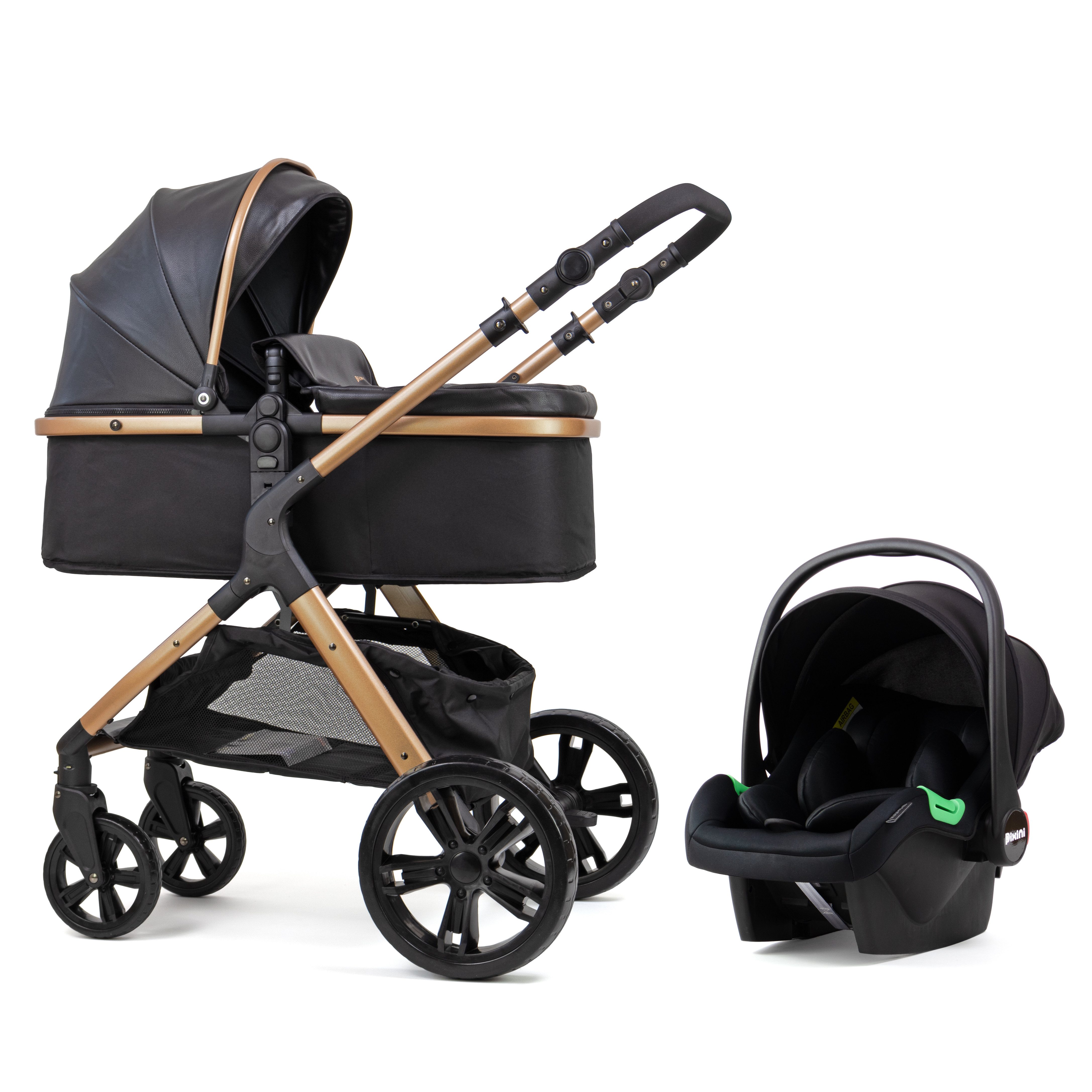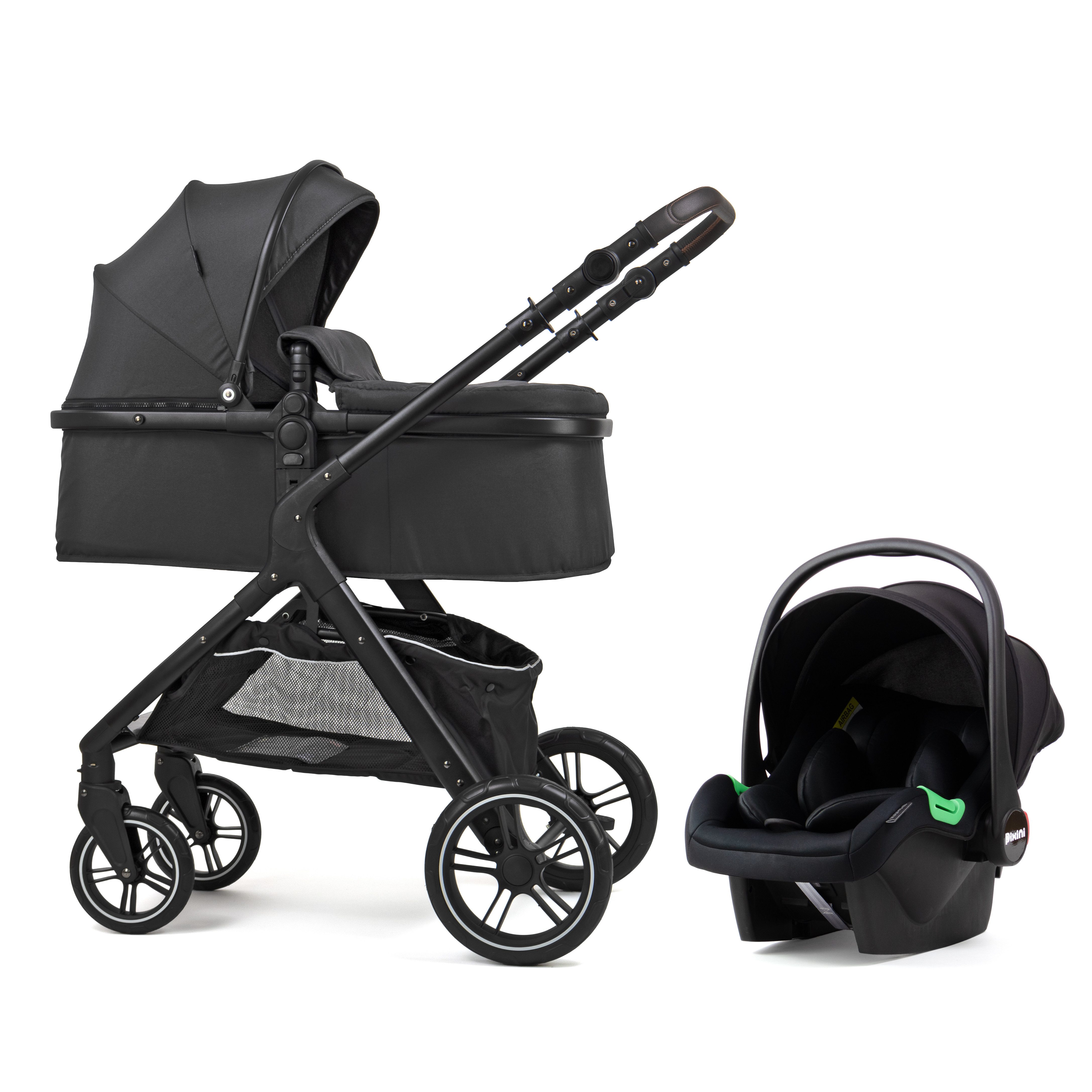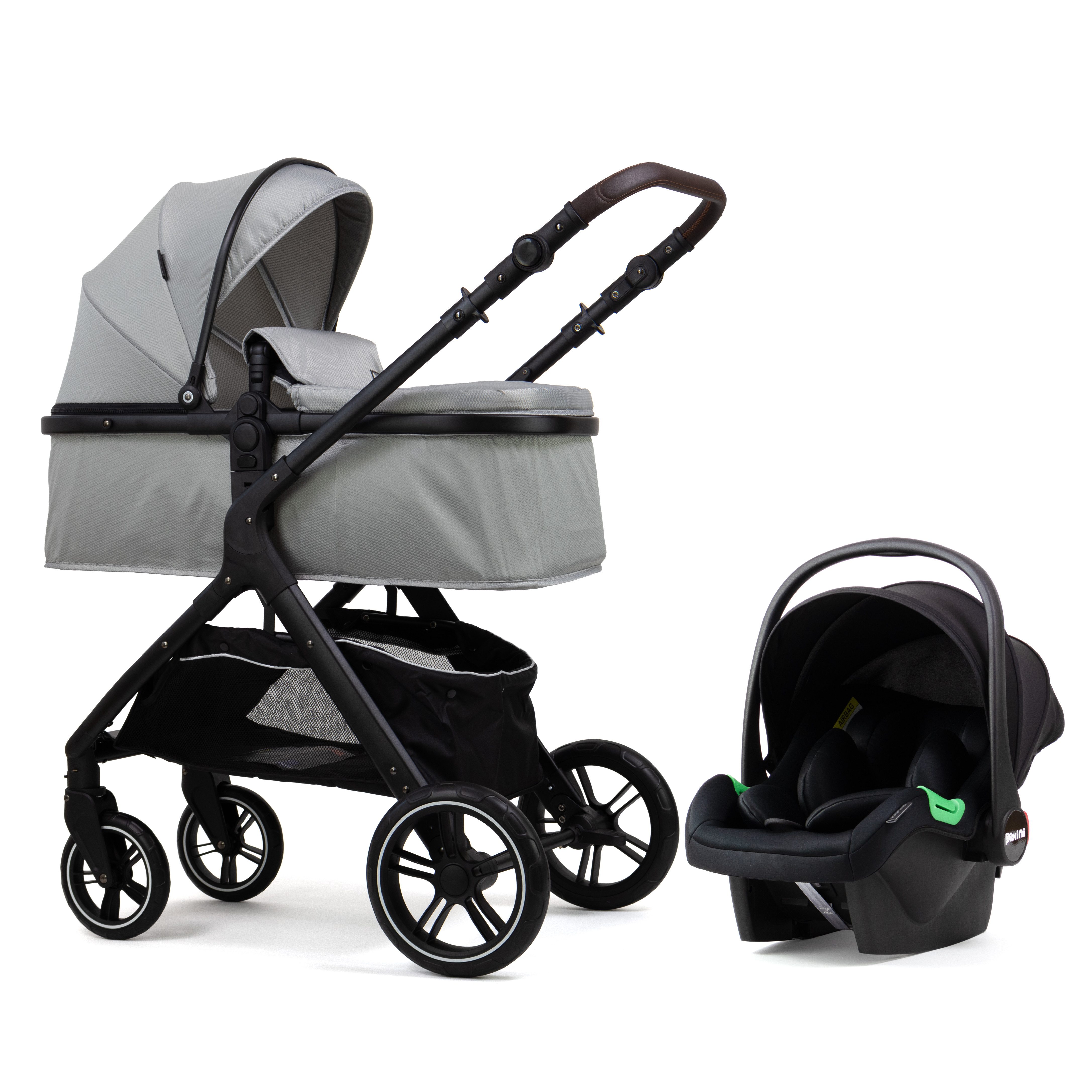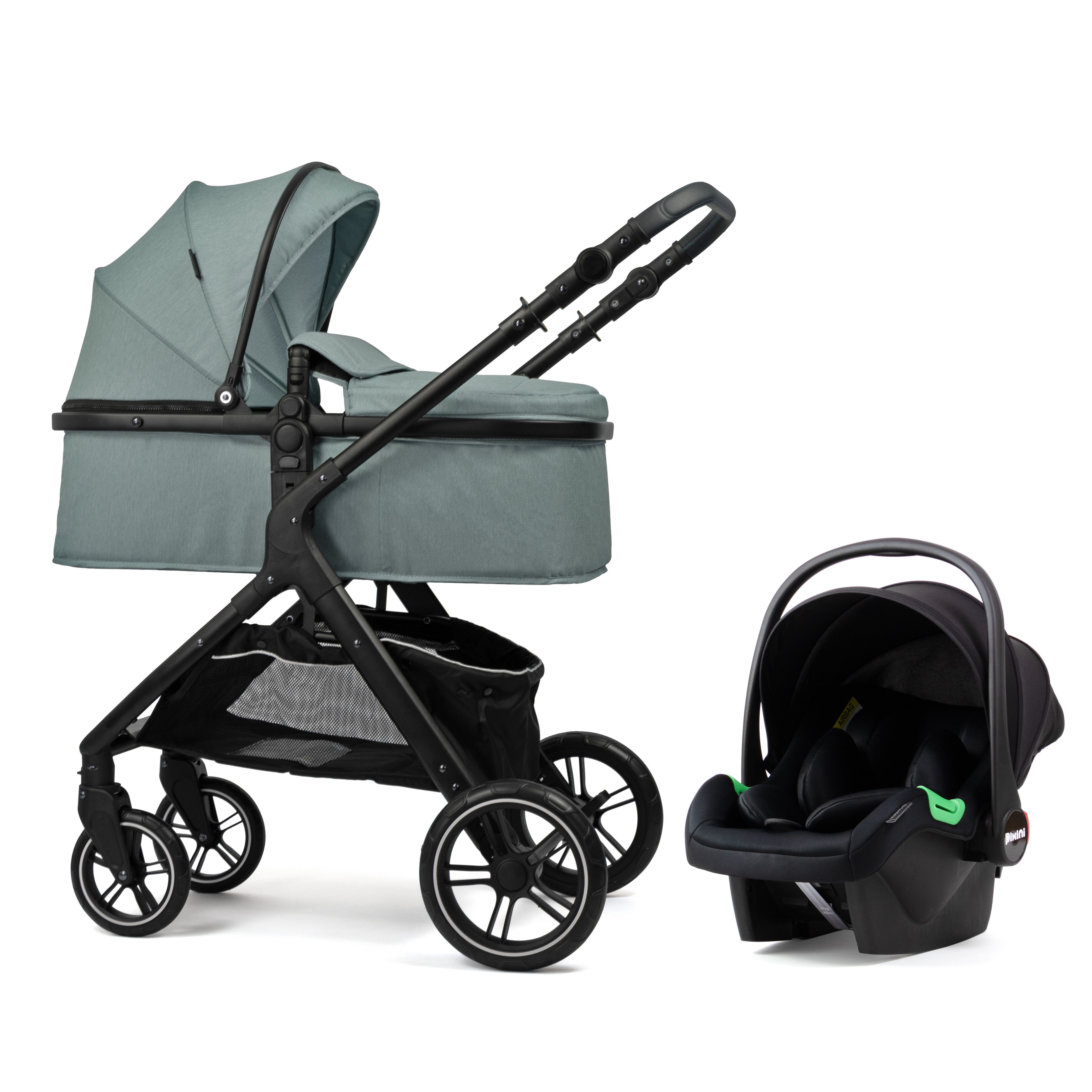 Lieferumfang | Kinderwagen, Einkaufskorb, Sportwagenaufsatz, Wanneneinsatz, Frontbügel, Sonnenverdeck, Becherhalter, weiche Matratzen- & Sitzeinlage, Babyschale mit Adapter |