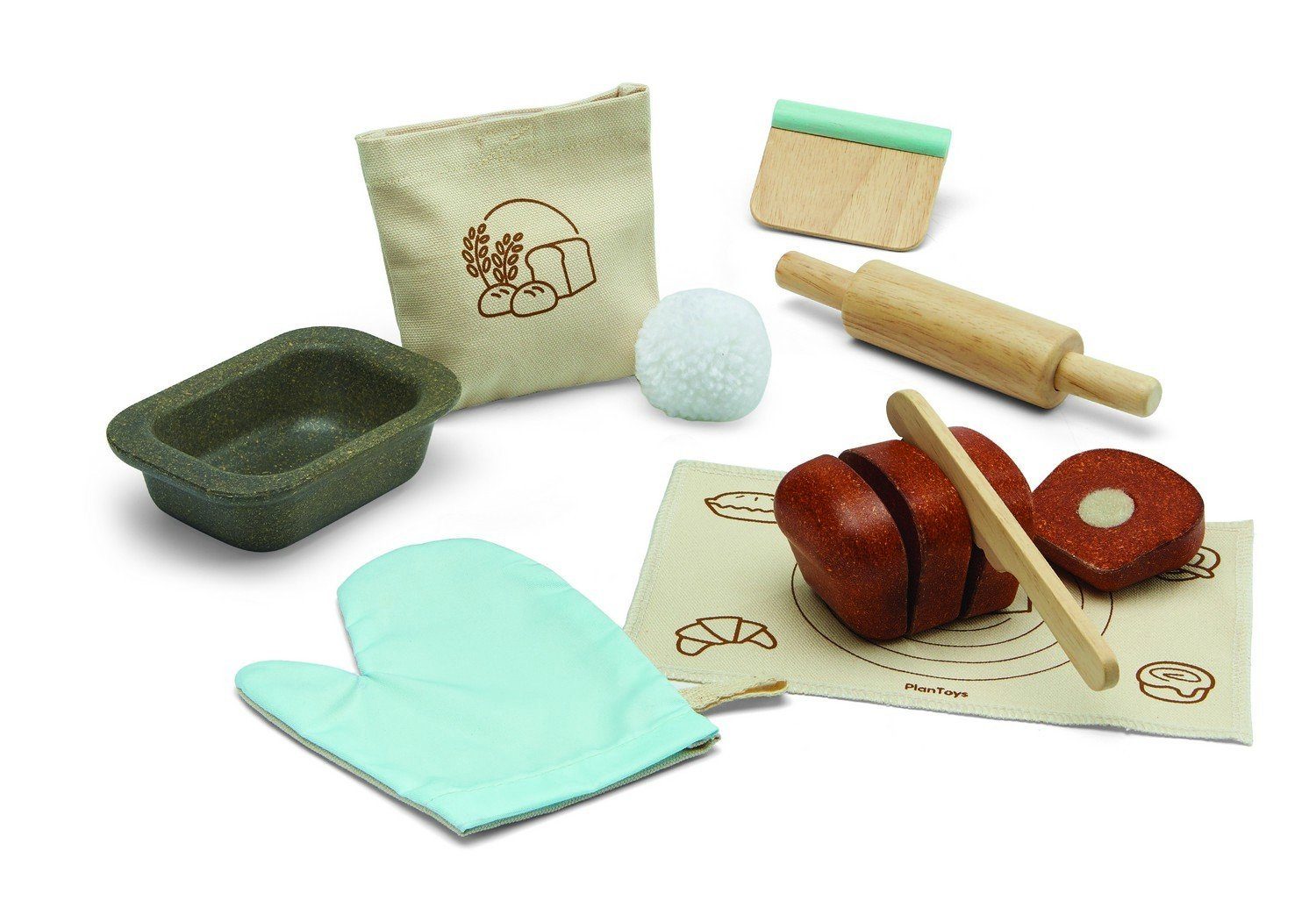 Spiele Bäcker mit dem Brot Backset! Ein realistischer Brotlaib, aus PlanWood ? hergestellt, kann mit dem mitgelieferten Brotmesser geschnitten werden. Eine Brotbackform, ein Nudelholz, ein Teigschneider, ein waschbarer Ofenhandschuh, eine Tüte Mehl und eine Brotknetmatte runden dieses Set ab und machen es zu einer einzigartigen Ergänzung für die Spielküche! Kinder lernen wie man die Utensilien richtig einsetzt, und fördern gleichzeitig einfallsreiches Denken, die Entwicklung feinmotorischer Fähigkeiten und den Einsatz von Kommunikation während des sozialen Spiels. Maße: (HxBxT): 18,8 x 23 x 9,5 cm.