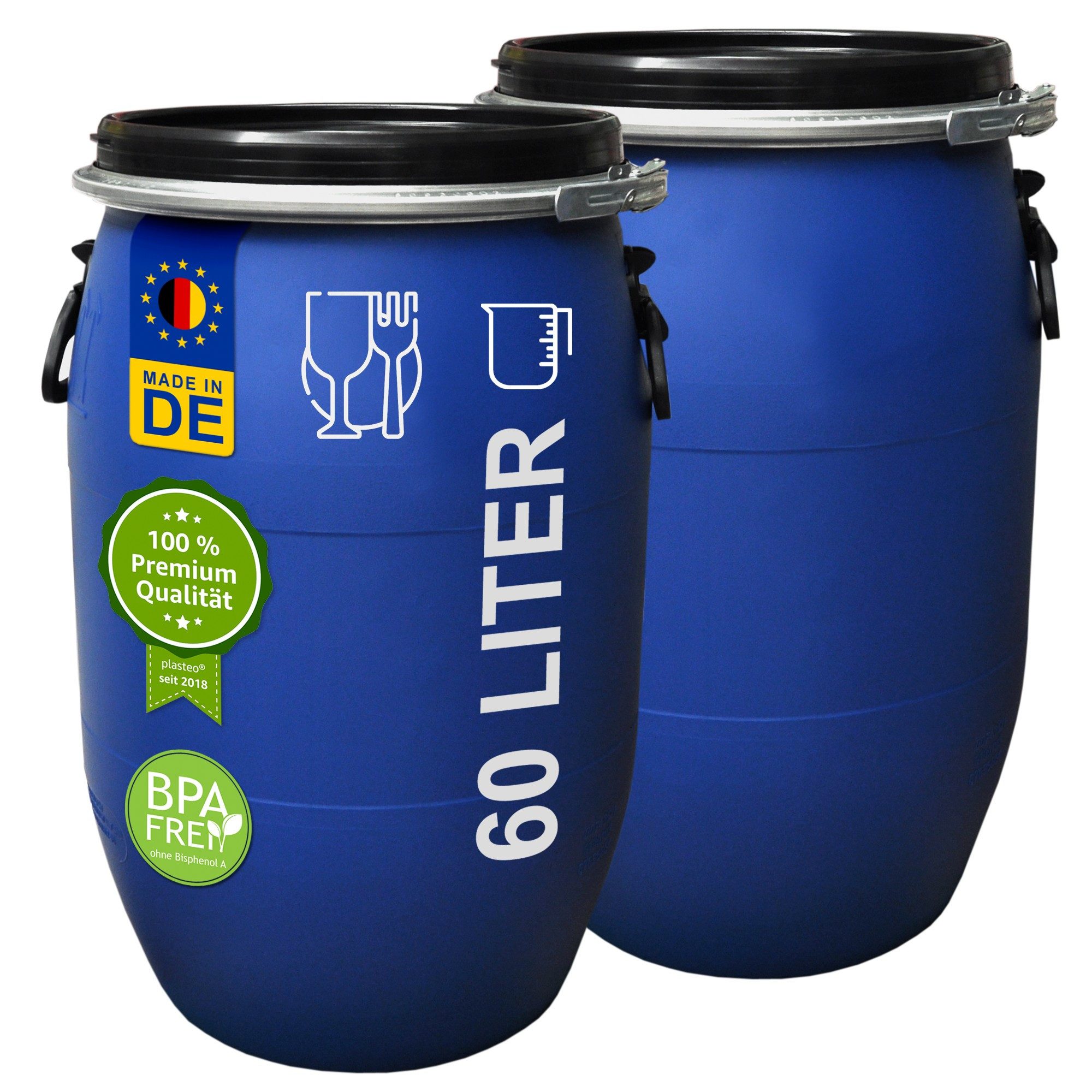 Sehr widerstandsfähiger und langlebiger Tonnenkörper (UN-Zulassung). Lagerfass aus lebensmittelechtem Kunststoff (HDPE). Seitliche Klick-Griffe mit 50° Trageanschlag. Material: Fasskörper HDPE - Deckel PE - Dichtung PU-Schaum - verzinkter Spannring mit Außenhebelverschluss + Sicherungssplint. Für Haus, Garten, Garage, Keller, Lagerhalle, Dachboden, Vorrats- Rumpelkammer, Bau. Für Sand, Kalklagerung, Streu- und Tausalz Belüftungsstift für Druckausgleich (vor Befüllung bitte entfernen). LIEFERUMFANG: 2x 60 Liter Deckelfass von Mauser | GRÖSSE: je 60 Liter Fassungsvermögen. Gewicht: 3 kg | Überlaufvolumen: 63 Liter | Höhe 63 cm | Durchmesser 40 cm | Einfüllöffnung 32,5 cm.