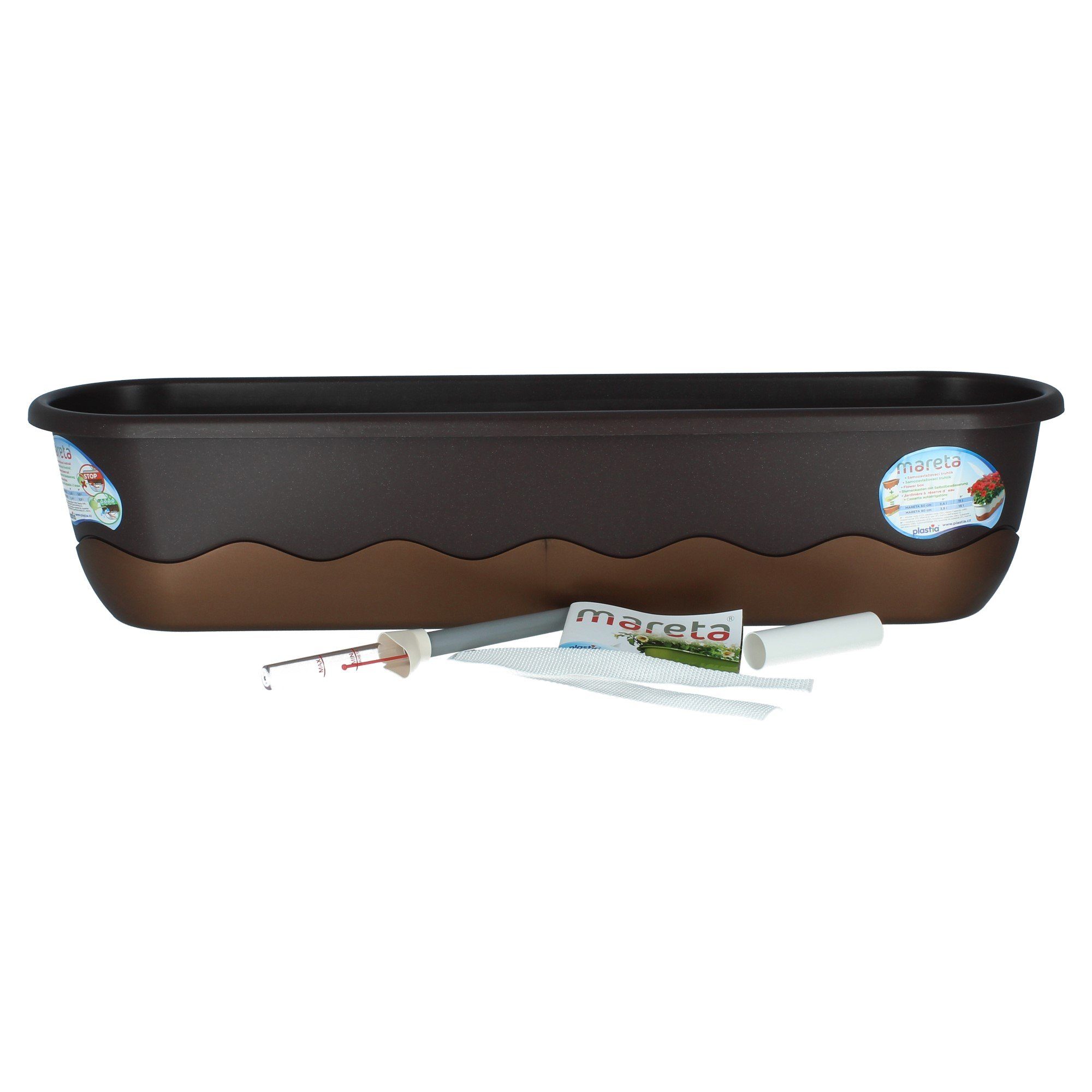 Der Plastia Mareta Blumenkasten wird mit Erdbewässerungssystem ausgeliefert. Die Aussparunge für die optional erhältlichen Balkonkastenhalter sind schon eingearbeitet. Die Kastenhalter werden von Plastia selbst nur als Zubehör angeboten. Diese sind bei diesem Produkt nicht dabei. Druch den robusten Kunststoff ist dieser Balkonkasten sehr stabil. Der Clou, durch das modulare System können Sie viele verschiedene Farbkombinationen zusammenstellen. Ober- und Unterteil des Kastens lassich sich frei miteinander kombinieren. Mit Überlauffunktion! Somit ist der Erfolg garantiert !