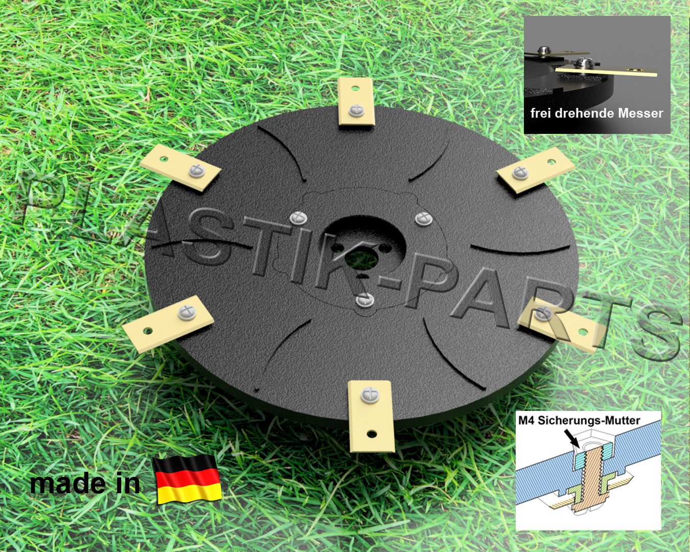 Messerteller / Messerscheibe für Gardena Sileno Plus - passend für Gardena R100Li - passend für Gardena R100LiC - passend für Gardena R130Li - passend für Gardena R130LiC - passend für Gardena R160Li - Farbe Schwarz - Durchmesser: 200mm / Schnittweite: 220mm - verbesserte Messeraufnahme zur sicheren Montage & wechseln der Messer - die Messer haben eine eigene Führung und Aufnahme und liegen nicht auf dem Kunststoff auf (wie bei anderen Anbietern üblich) - optimale Zentrierung der Messer - frei drehende Messer - keine beschädigten Gewinde mehr - kein Adapter notwendig - Messeraufnahme in Originalgröße M4 - aus ABS Kunststoff / sehr stabil - Messer mit 7mm Aufnahme können genutzt werden - Lieferung mit oder ohne Messer möglich / je nach Auswahl - 6x Schraube & 6x Messeraufnahme & 6x Sicherungsmutter sind inklusive ob mit oder ohne Messer bestellt wird - passende Antriebsräder für Ihren Mähroboter finden Sie in unseren weiteren Angeboten Lieferumfang: - Messerscheibe in 200mm Durchmesser für 6 Klingen passend für Gardena Sileno Plus R100Li / R100LiC / R130Li / R130LiC / R160Li Mähroboter Original Ersatzteil-Nummern dienen ausschließlich zu Vergleichszwecken. Beispielfoto, die gelieferte Ware kann der Abbildung abweichen.