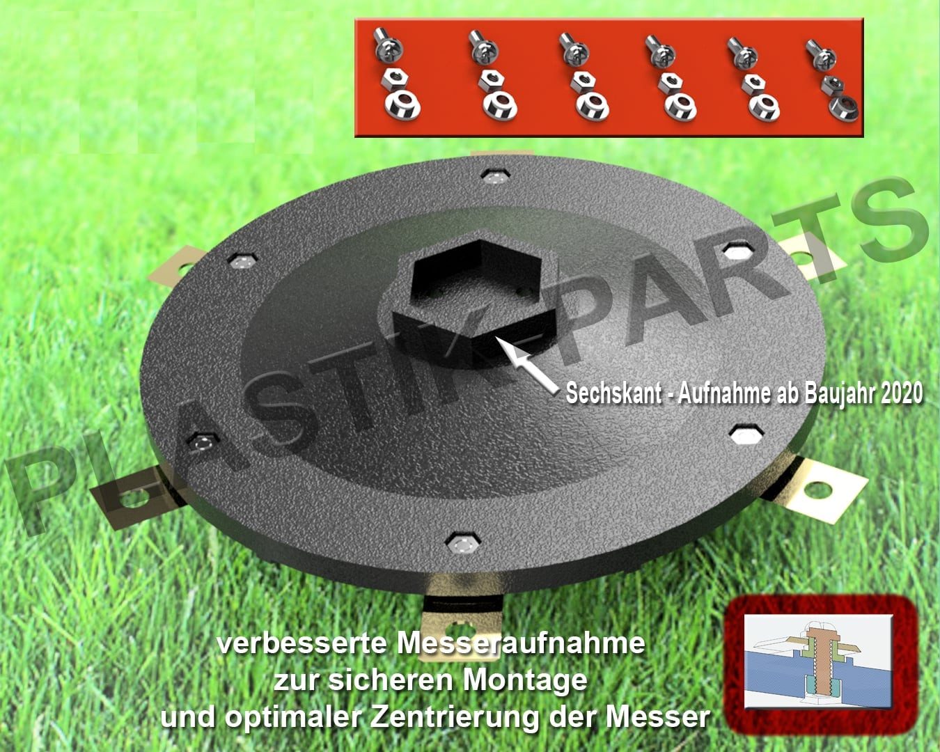 Messerteller / Messerscheibe für KRESS KR Mähroboter - sechskant Aufnahme - passend für Kress KR Mähroboter ab Baujahr 2020 - passend für Kress KR 120 - passend für Kress KR 121 - passend für Kress KR 121E - passend für Kress KR 122 - Farbe Schwarz - Durchmesser: 150mm / Schnittweite: 180mm - Durchmesser: 190mm / Schnittweite: 220mm - bitte die vorhandene Messerscheibe messen / einige Robos wie z.b. der KR121E habem eine 190mm Messerscheibe, da ist die 150mm einfach zu klein - verbesserte Messeraufnahme zur sicheren Montage & wechseln der Messer - die Messer haben eine eigene Führung und Aufnahme und liegen nicht auf dem Kunststoff auf (wie bei anderen Anbietern üblich) - optimale Zentrierung der Messer - frei drehende Messer - keine beschädigten Gewinde mehr - kein Adapter notwendig - Messeraufnahme in Originalgröße M4 - aus ABS Kunststoff / sehr stabil - originale Messer und Messer aus dem Zubehör können genutzt werden - Lieferung mit oder ohne Messer möglich / je nach Auswahl - 6x Messeraufnahme & 6x Sicherungsmutter sind inklusive ob mit oder ohne Messer bestellt wird - die Messerscheibe für Mähroboter bis Baujahr 2020 mit runder Aufnahme finden Sie in unseren weiteren Angeboten Lieferumfang: - Messerscheibe in 150mm oder 190mm Durchmesser je nach Auswahl für 6 Klingen passend für Kress KR Mähroboter Original Ersatzteil-Nummern dienen ausschließlich zu Vergleichszwecken. Beispielfoto, die gelieferte Ware kann der Abbildung abweichen.