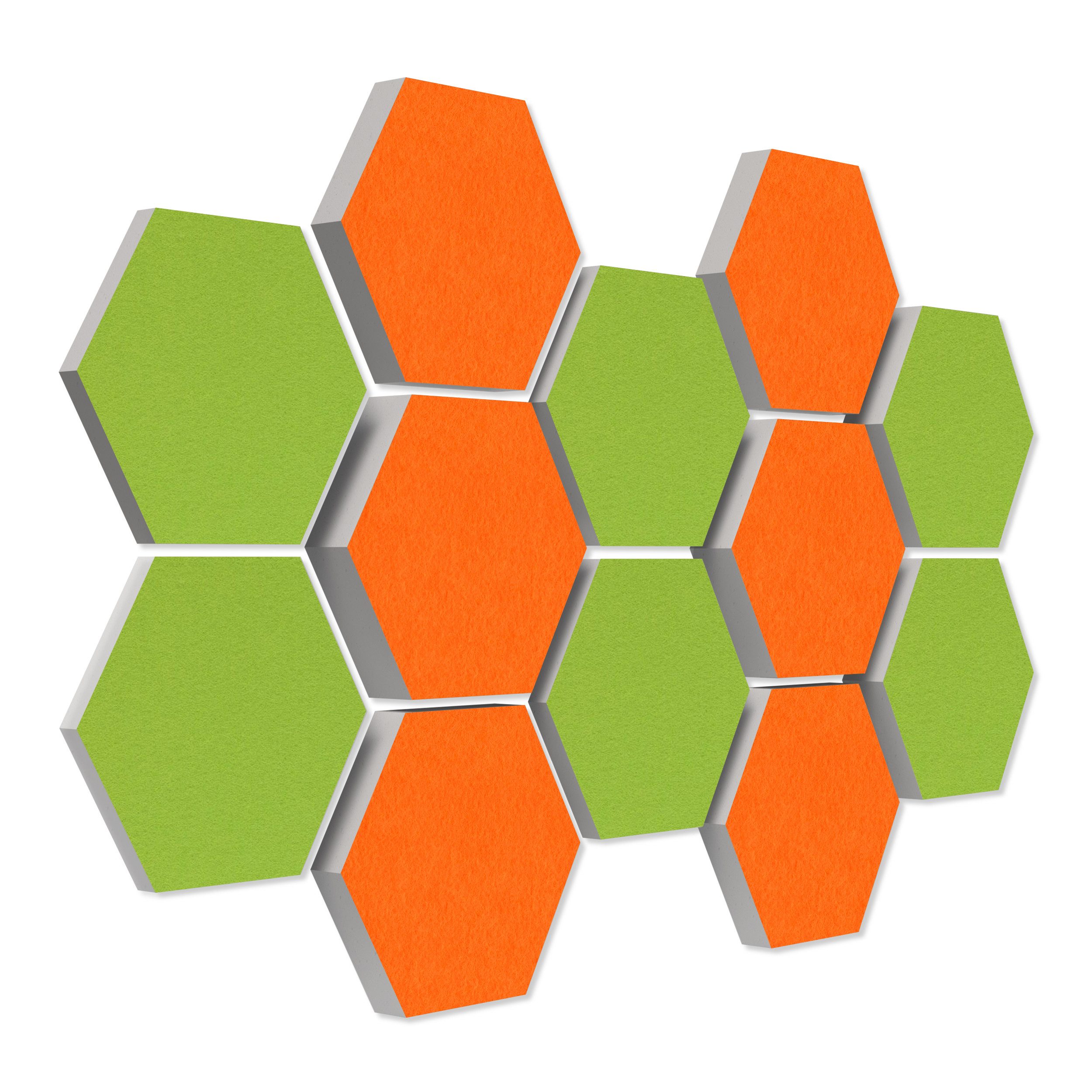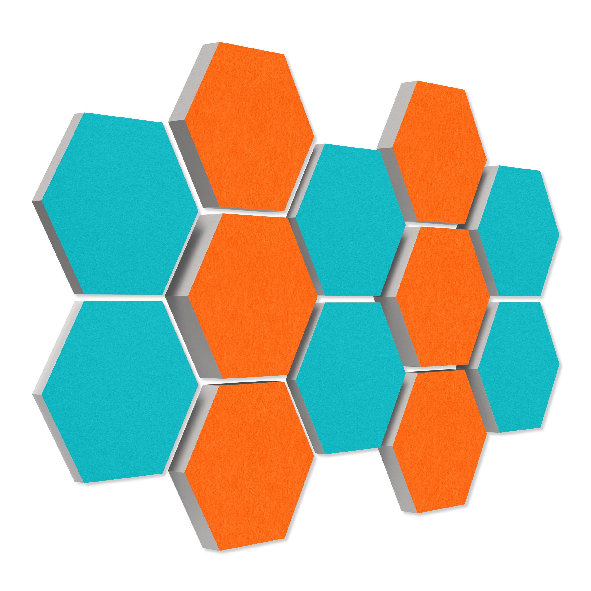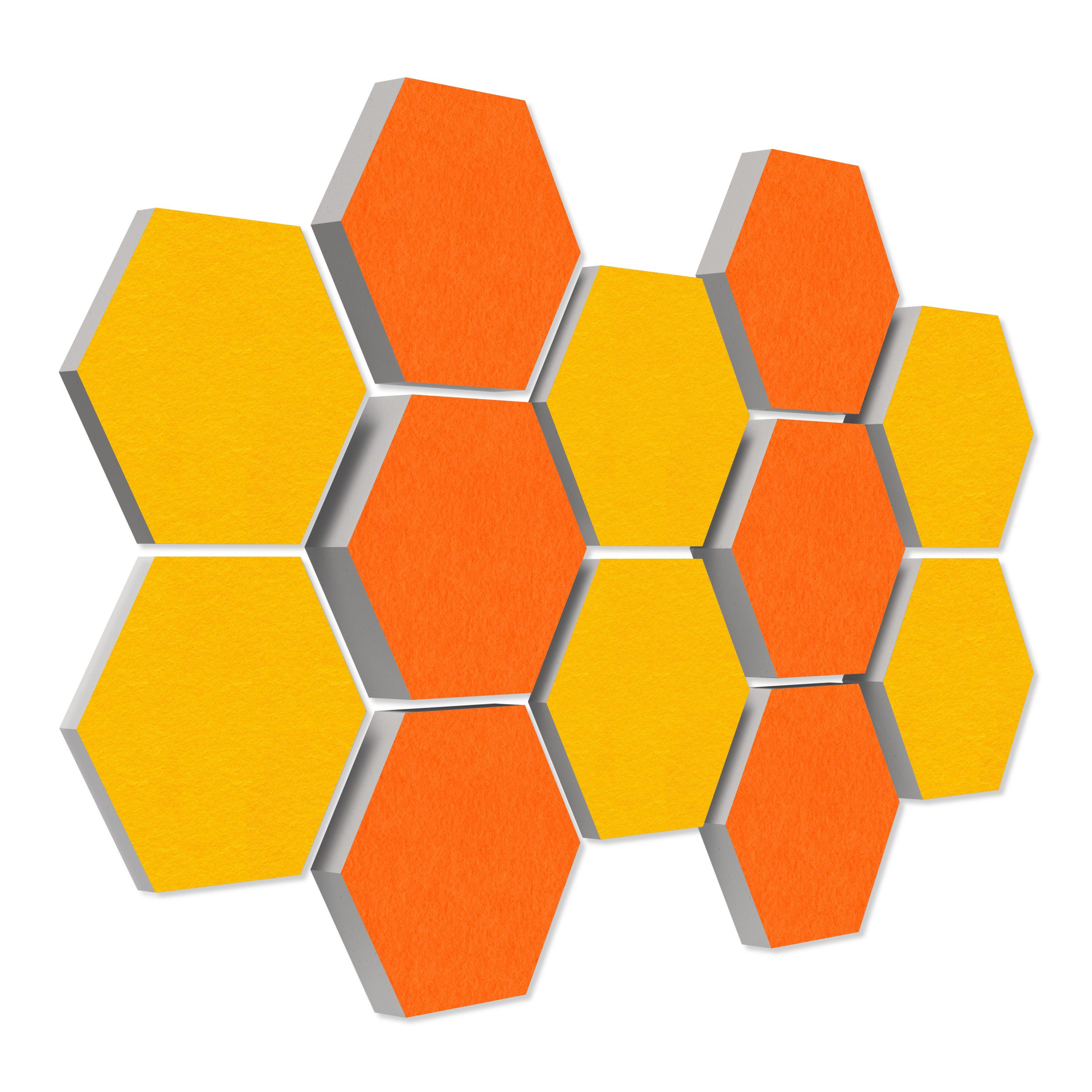 12 Elemente Hexagon Ø 30cm, je 4x 3cm Stärke, je 4x 5cm Stärke & je 4x 7cm Stärke, Oberseite farbiger Akustikfilz.
