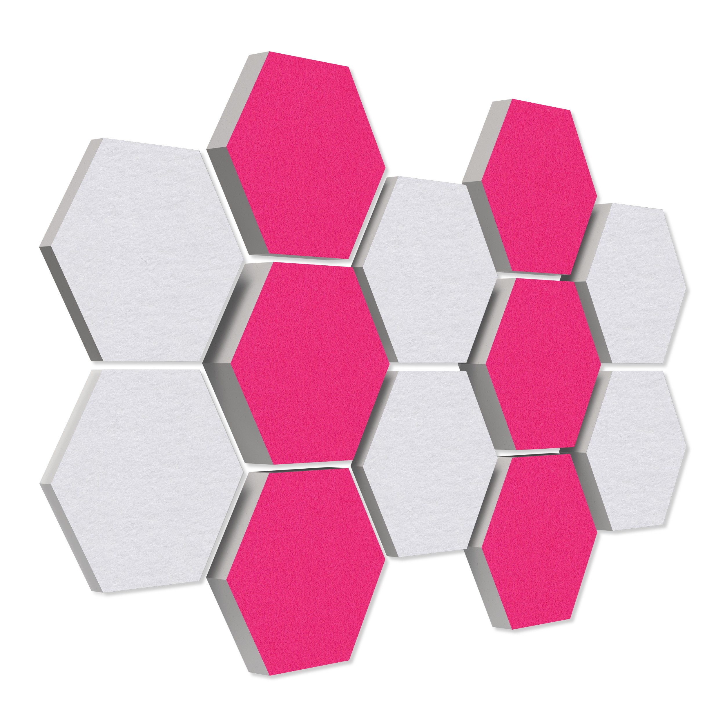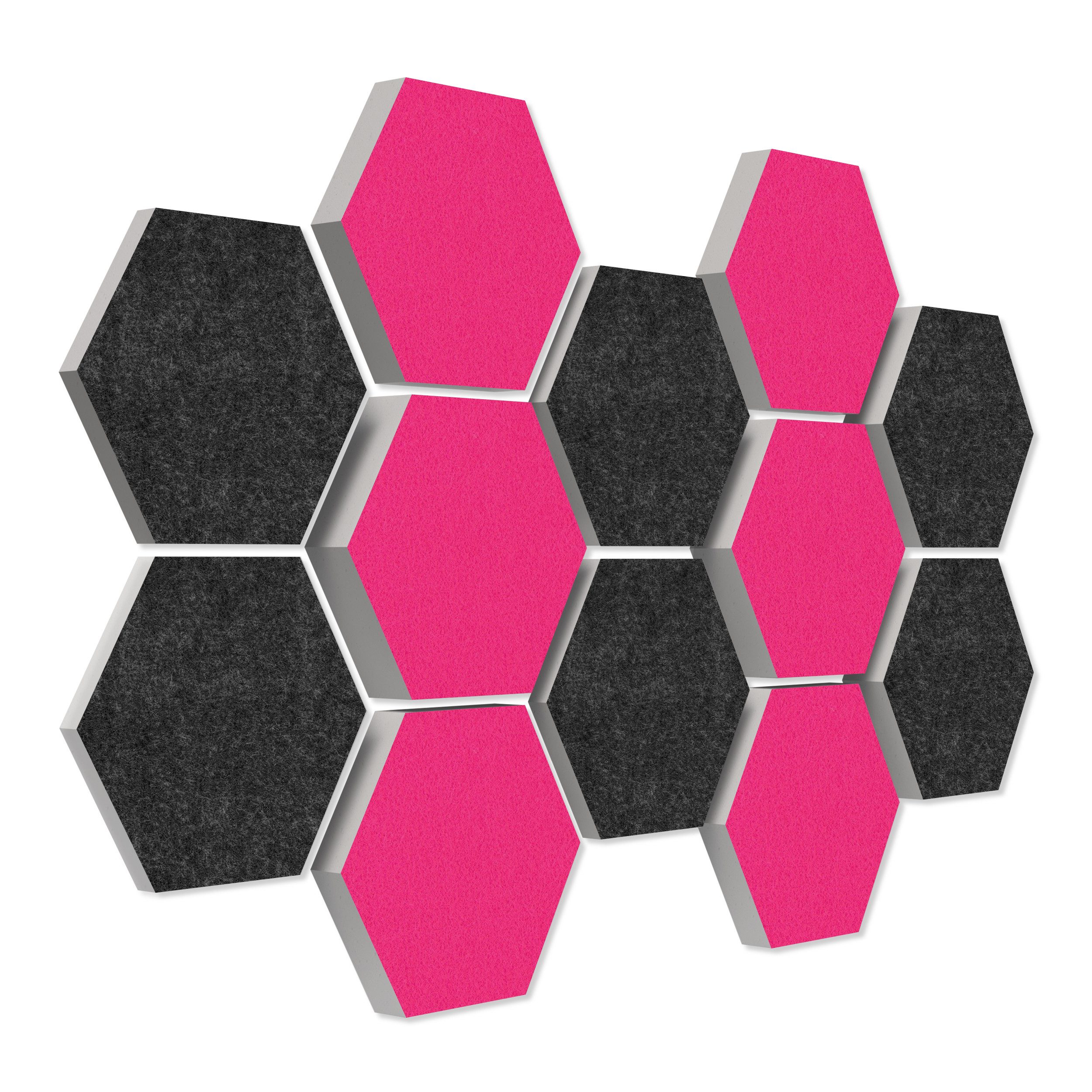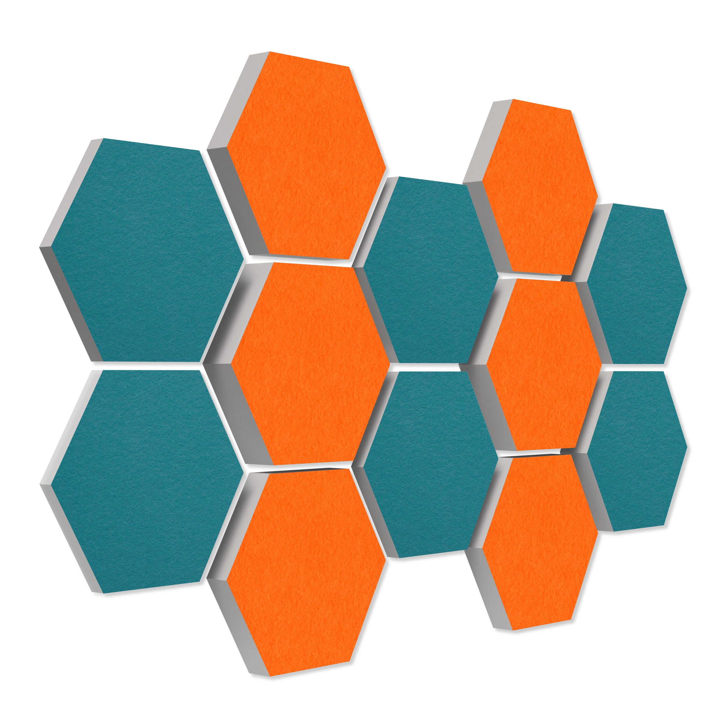 12 Elemente Hexagon Ø 30cm, je 4x 3cm Stärke, je 4x 5cm Stärke & je 4x 7cm Stärke, Oberseite farbiger Akustikfilz.