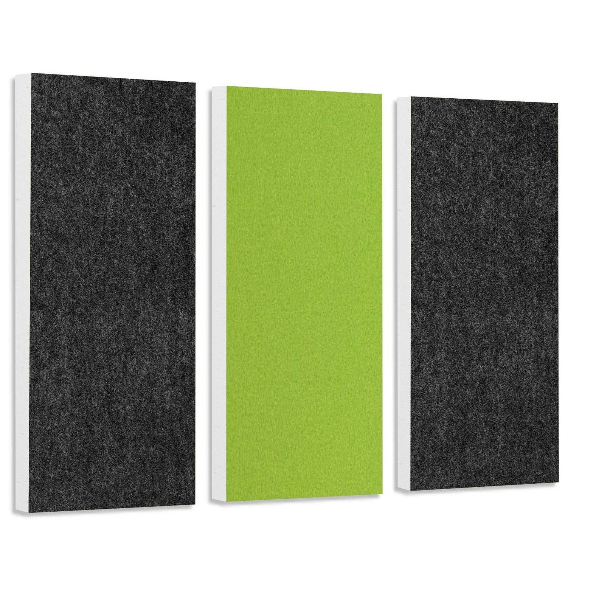 Lieferumfang: 3 Akustikelemente mit hochwertiger Filzoberfläche: 2 Stück je 825 x 275 x 50 mm - Farbe Anthrazit 1 Stück je 825 x 275 x 50 mm - Farbe Hellgrün