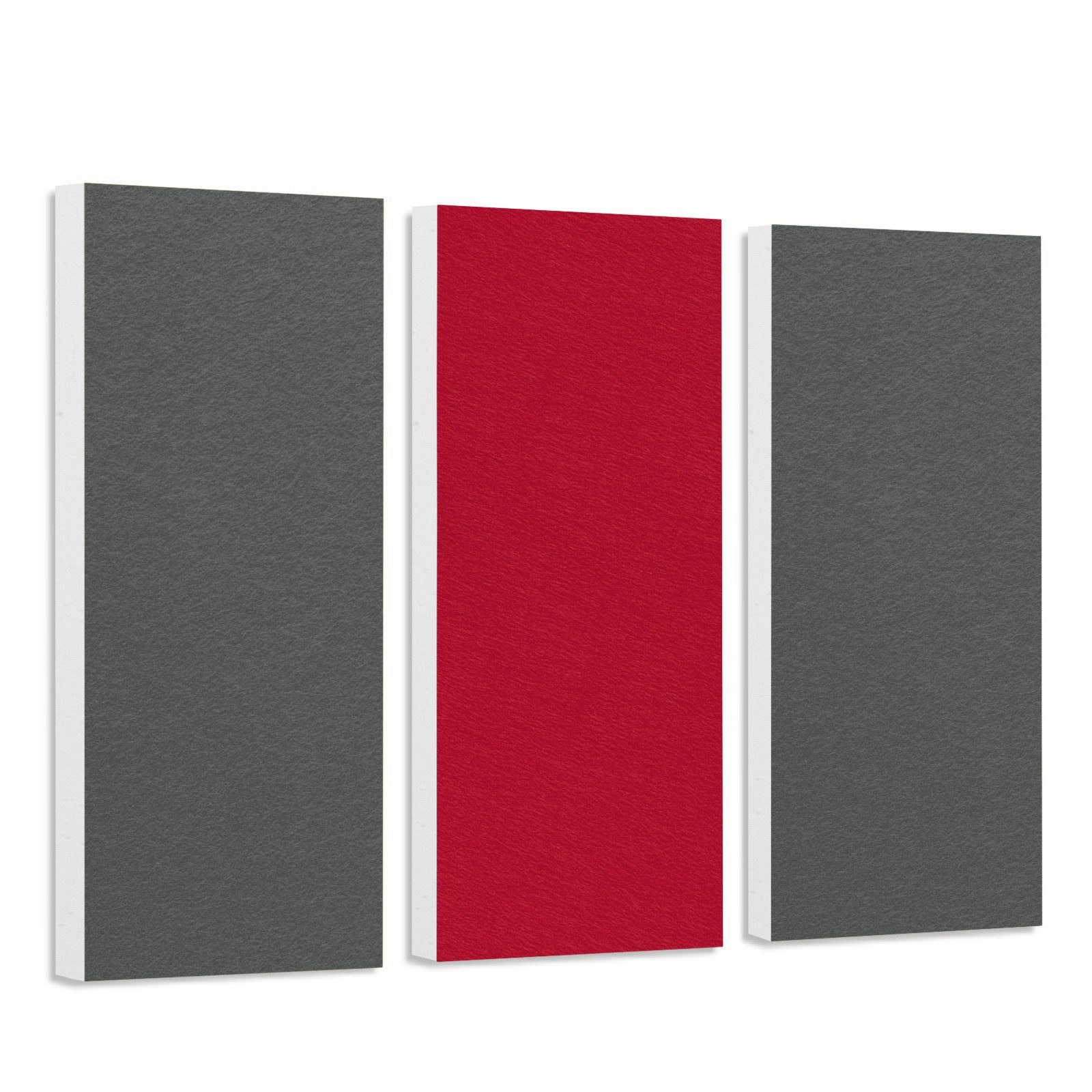 Lieferumfang: 3 Akustikelemente mit hochwertiger Filzoberfläche: 2 Stück je 825 x 275 x 50 mm - Farbe Granitgrau 1 Stück je 825 x 275 x 50 mm - Farbe Bordeaux