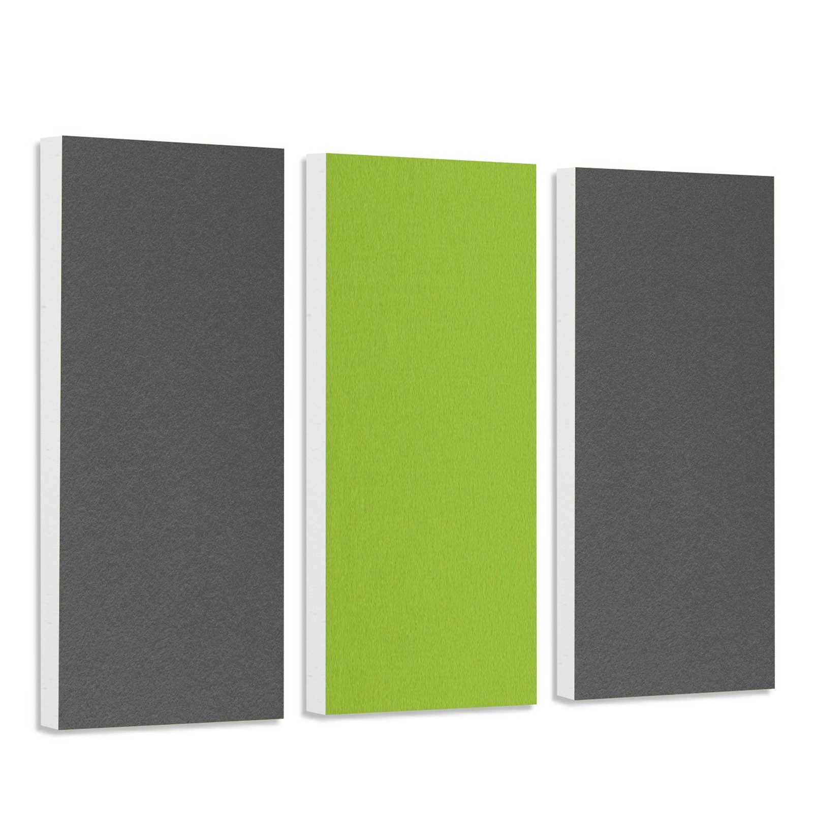 Lieferumfang: 3 Akustikelemente mit hochwertiger Filzoberfläche: 2 Stück je 825 x 275 x 50 mm - Farbe Granitgrau 1 Stück je 825 x 275 x 50 mm - Farbe Hellgrün