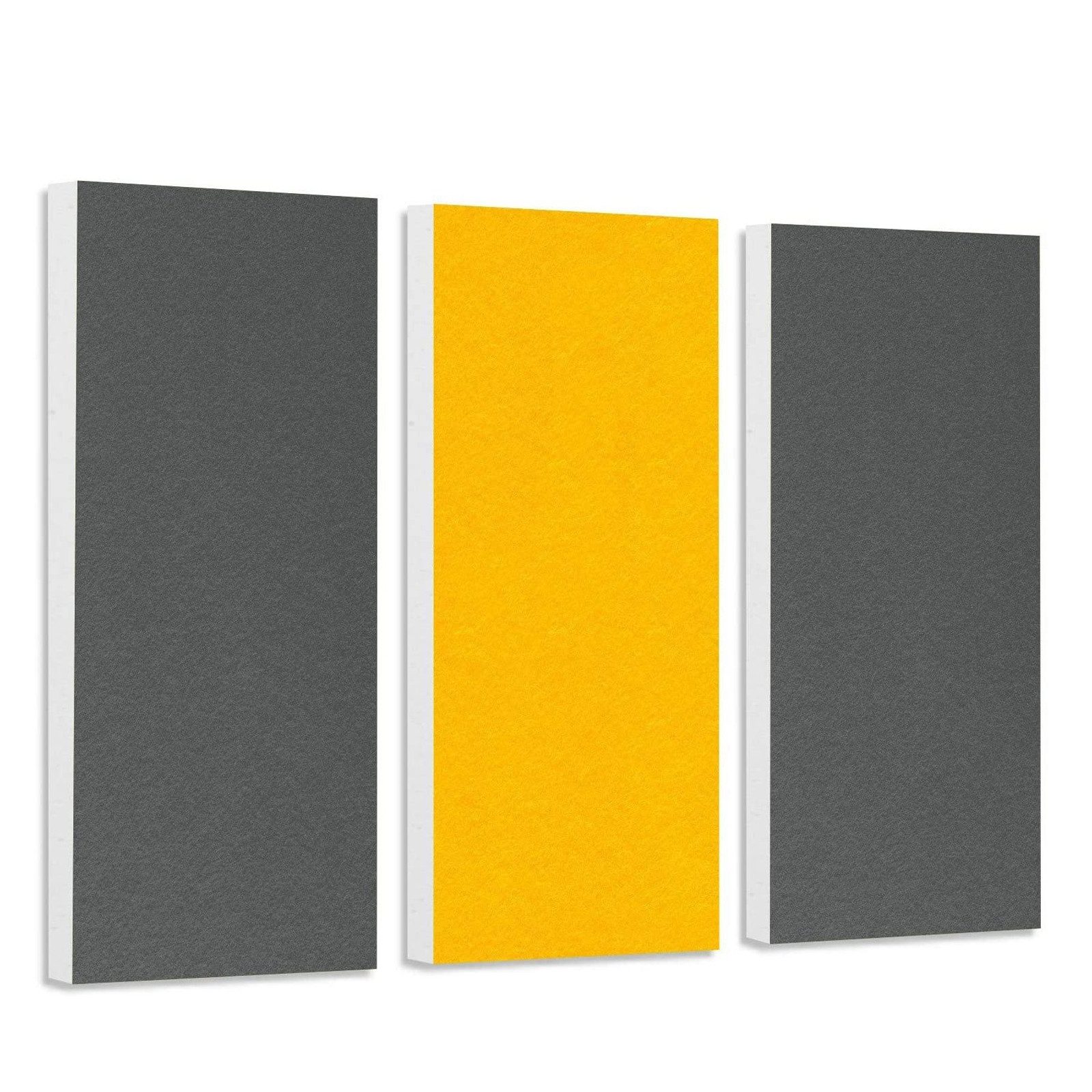 Lieferumfang: 3 Akustikelemente mit hochwertiger Filzoberfläche: 2 Stück je 825 x 275 x 50 mm - Farbe Granitgrau 1 Stück je 825 x 275 x 50 mm - Farbe Sonnengelb