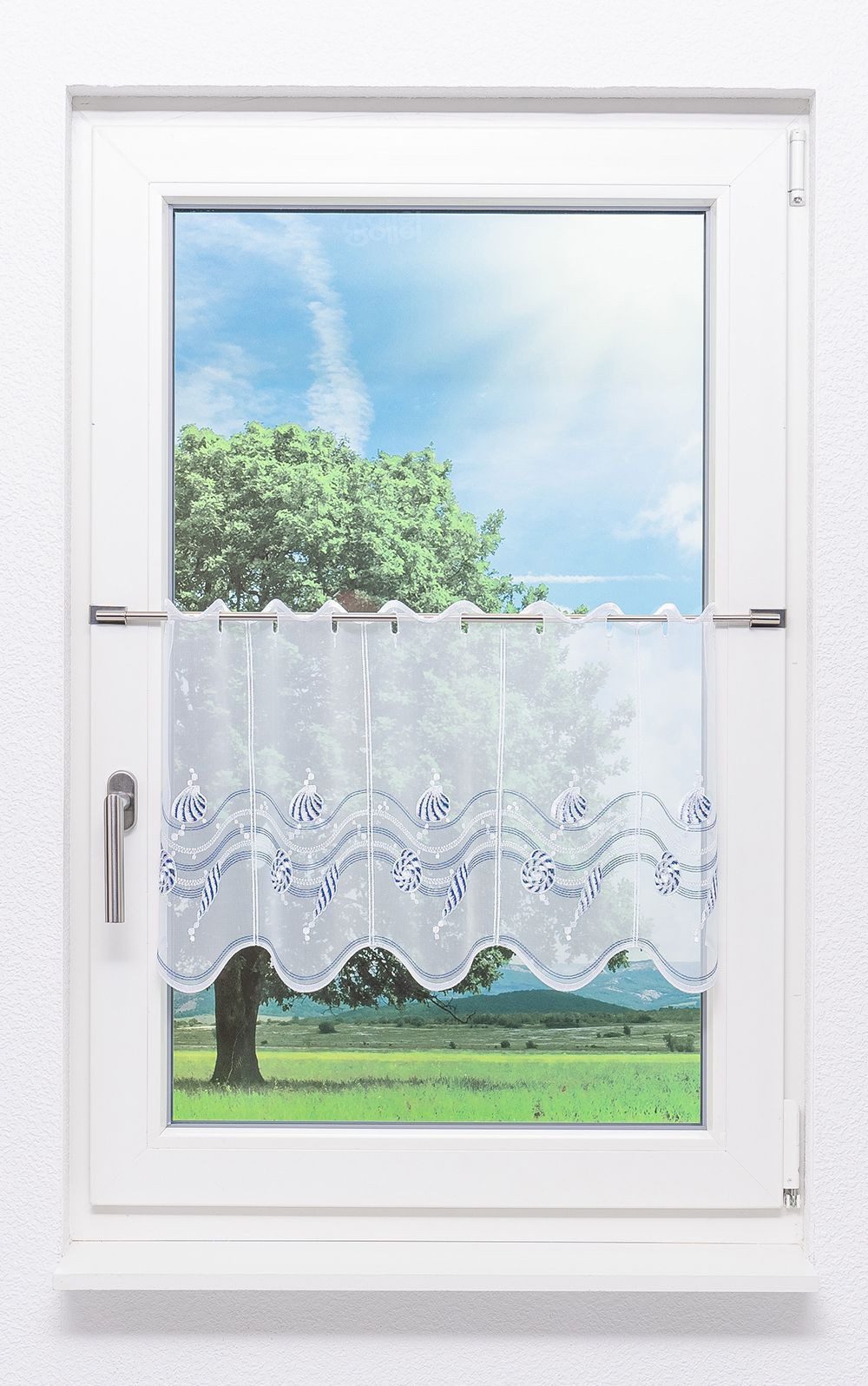 Nur weiß und blau sind die vorherrschenden Farben auf dieser maritimen Scheibengardine. Kleine Muscheln und Schneckenhäuser sind aufgereiht an eine Welle, die an die Oberfläche des Meeres erinnert. Ideal für Badezimmerfenster eignet sich diese hübsche Kurzgardine als Sichtschutz und Dekorationsobjekt zugleich...