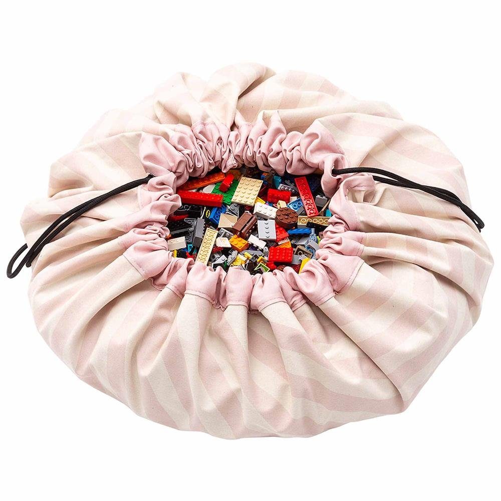 Die Spieldecke mit rosa Streifen-Print ist Spielzeugtasche und Spielteppich in einem. Dank praktischer Kordel zum Zuziehen ist der robuste Baumwollbeutel auch ein perfekter Begleiter für unterwegs.