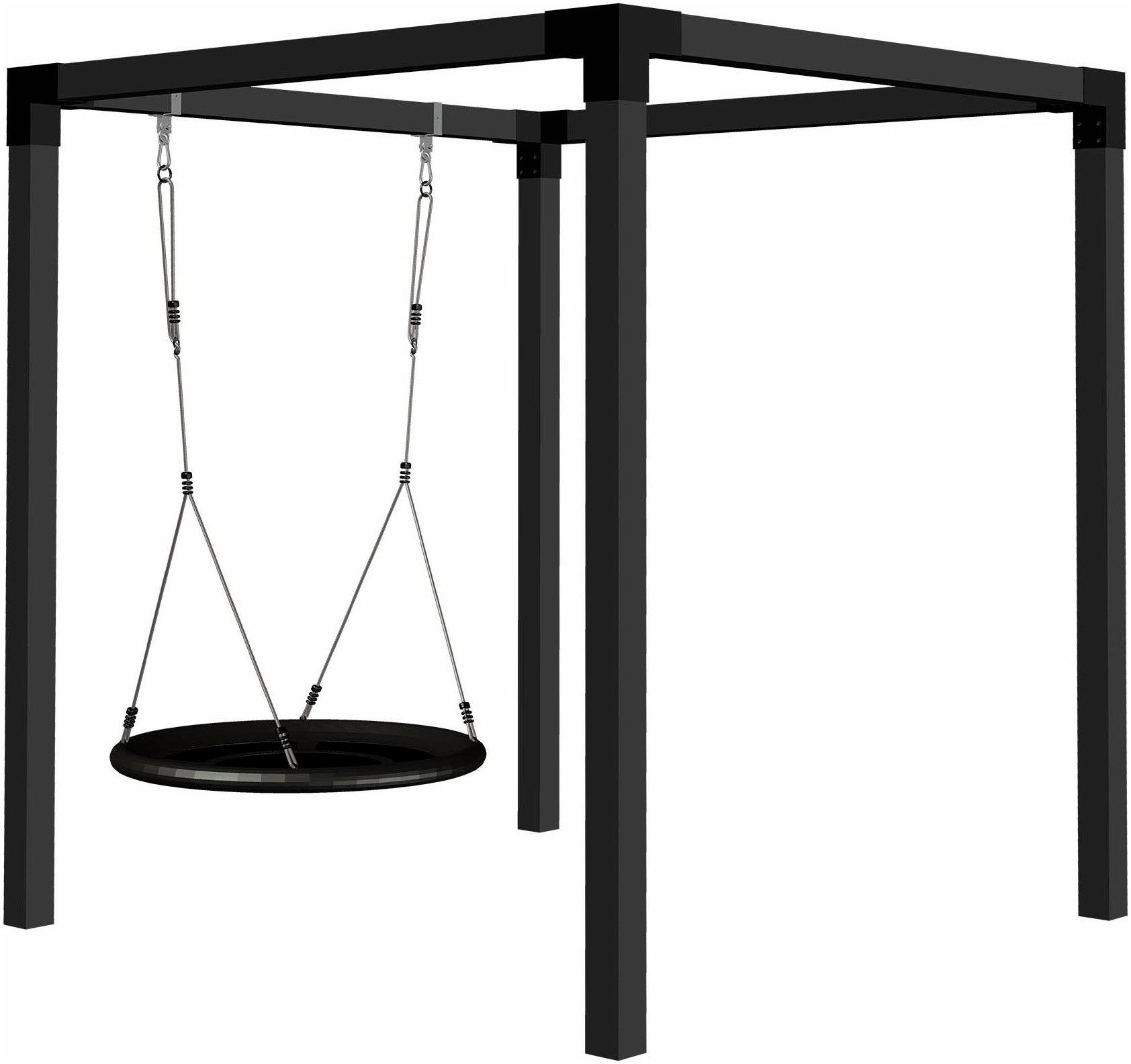 Lieferumfang | 4 Cubic Eckbeschläge (20x20x20 cm) feuerverzinkt und pulverlackiert schwarz Inklusive Schrauben Schaukelgestell Schaukelnest inkl. 2 Karabiner |