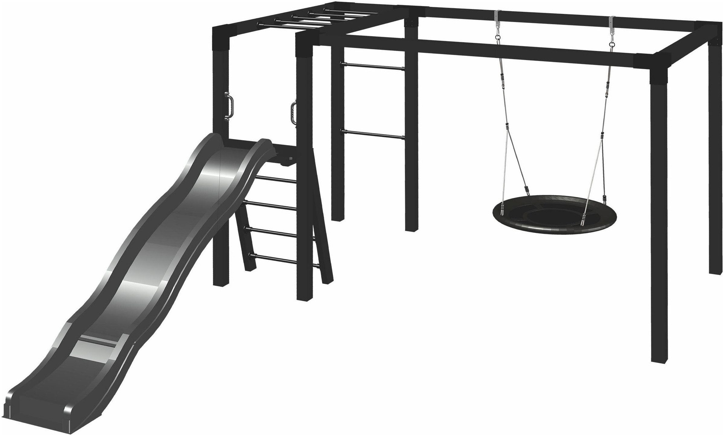 Ausstattung | Cubic Beschlag Druckimprägniert und farbgrundiert schwarz Griffe Inkl. Schrauben Leiter Reckstangen Rutsche Schaukelnest aus wasserabweisendem Gewebe mit PE-Netz und gepflochtenem Seil mit schwarzen PP-Schweisnähten Verleimte Holzpfosten 9x9 cm zum Eingraben |