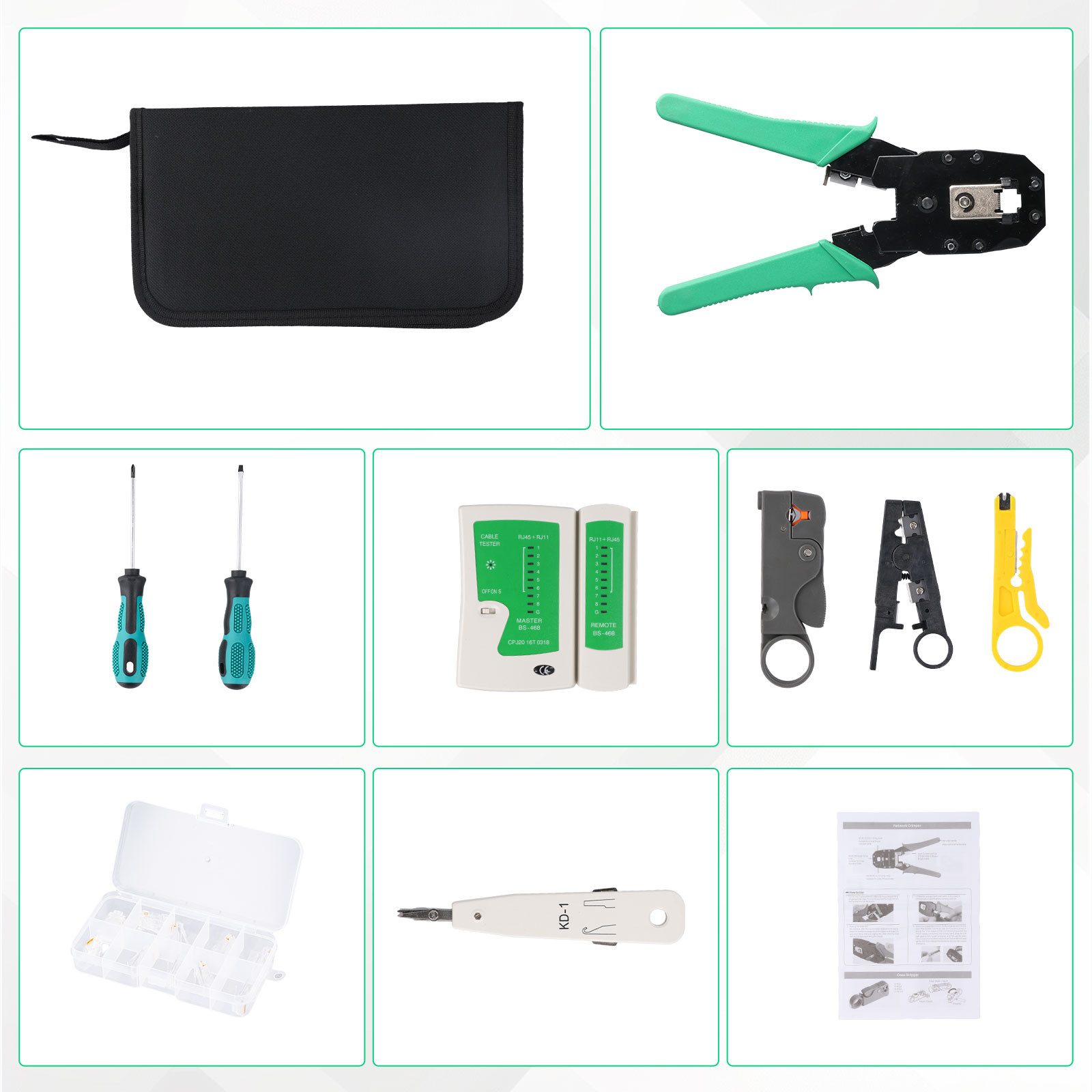 Das Werkzeugset enthält eine Crimpzange, einen Netzwerkkabeltester (ohne Batterie), ein Abisoliermesser, einen Flach-/Kreuzschlitzschraubendreher, eine Abisolierzange, ein Punch-Down-Werkzeug, einige Telefonkabelverbinder und RJ45-Stecker.