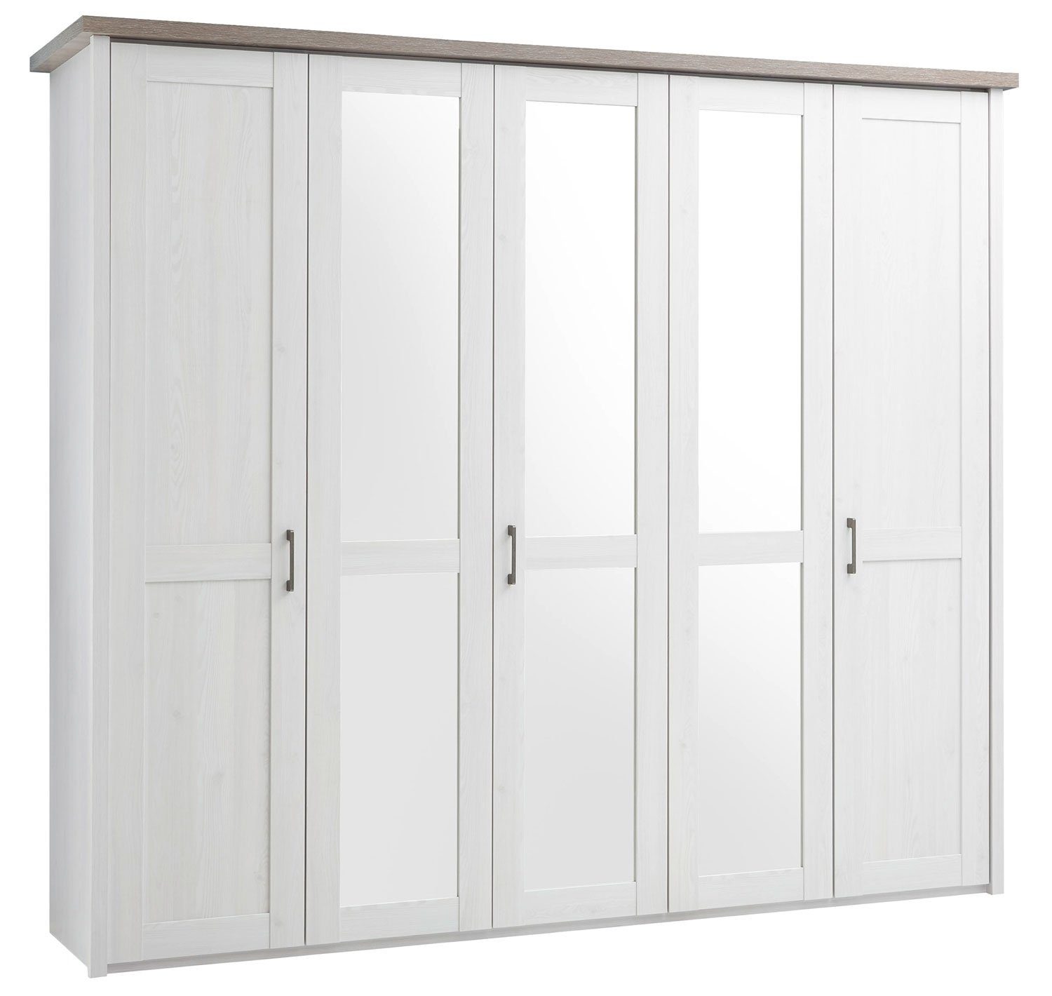 Der Lieferumfang umfasst einen Kleiderschrank mit insgesamt 5 Türen, darunter 3 Spiegeltüren, 2 Türen ohne Spiegel, 2 Kleiderstangen und 6 Einlegeböden. Die Kombination der Dekore in Pinie weiß und Trüffel schafft eine harmonische Optik, während die Spiegeltüren dem Raum eine zusätzliche Dimension verleihen.