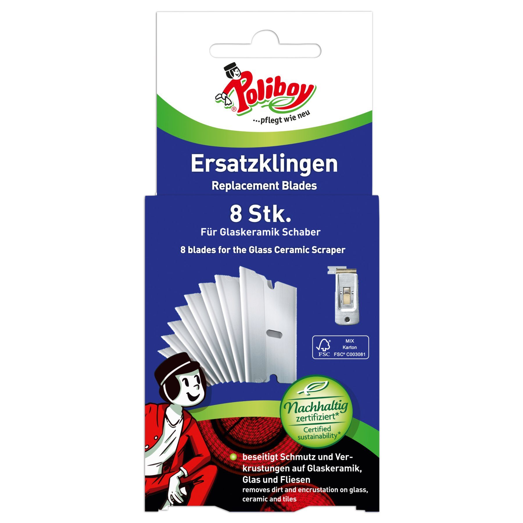 Ersatzklingen Die speziellen POLIBOY Ersatzklingen Kohlenstoffstahl sind im 8er Pack erhältlich und gehören zum POLIBOY Glaskeramik Schaber