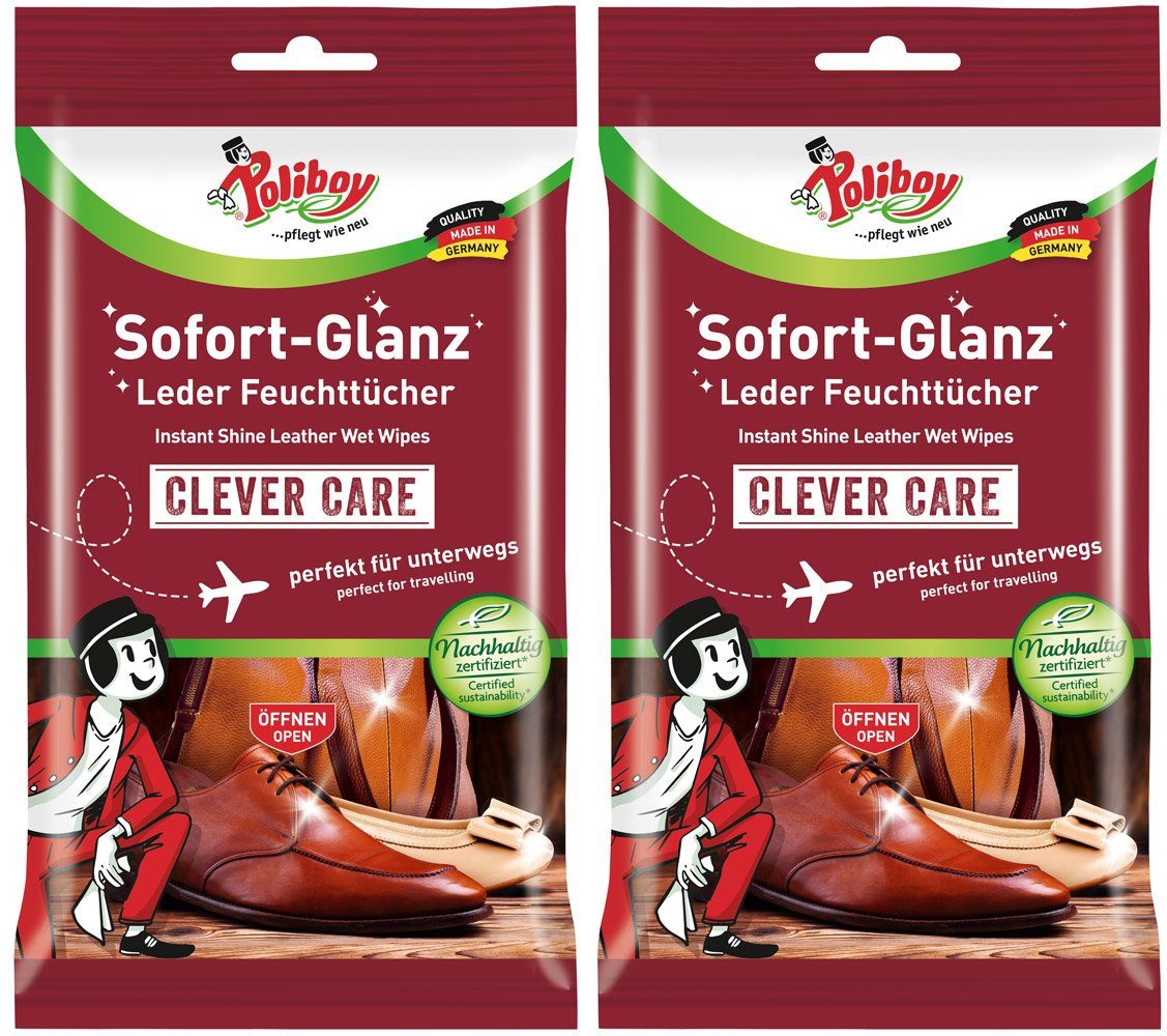 Die gebrauchsfertigen Tücher sind auch ideal zur Anwendung unterwegs. Einfach nur abreiben und trocknen lassen, der Glanz kommt von selbst. So können Sie kurz vor einem Termin eben noch schnell Ihren Schuhen Sauberkeit und einen seidigen Glanz geben. Die Tücher nähren das Leder, halten es widerstandsfähig sowie geschmeidig und durch Tiefenimprägnierung fleck- und wasserabweisend. Gleichzeitig frischt es wunderbar auf und gibt einen schönen Glanz. Die Putztücher eignen sich für alle Glatt- und Kunstlederschuhe. Parfümöle geben dem Leder einen angenehmen frischen Duft. Bei der Herstellung werden keine Lösemittel und hautresorptiven Substanzen eingesetzt, so dass keine Stoffe über die Haut in den Körper gelangen können. Все Tenside sind auf Basis nachwachsender Rohstoffe und biologisch vollständig abbaubar und übertreffen die Anforderungen der Detergenzienverordnung. Die POLIBOY Sofort-Glanz Putztücher enthalten eine Lotion aus pflanzlichem Carnaubawachs, speziell abgestimmte Pflege- und Imprägnierstoffe und reinigungsaktive Substanzen.