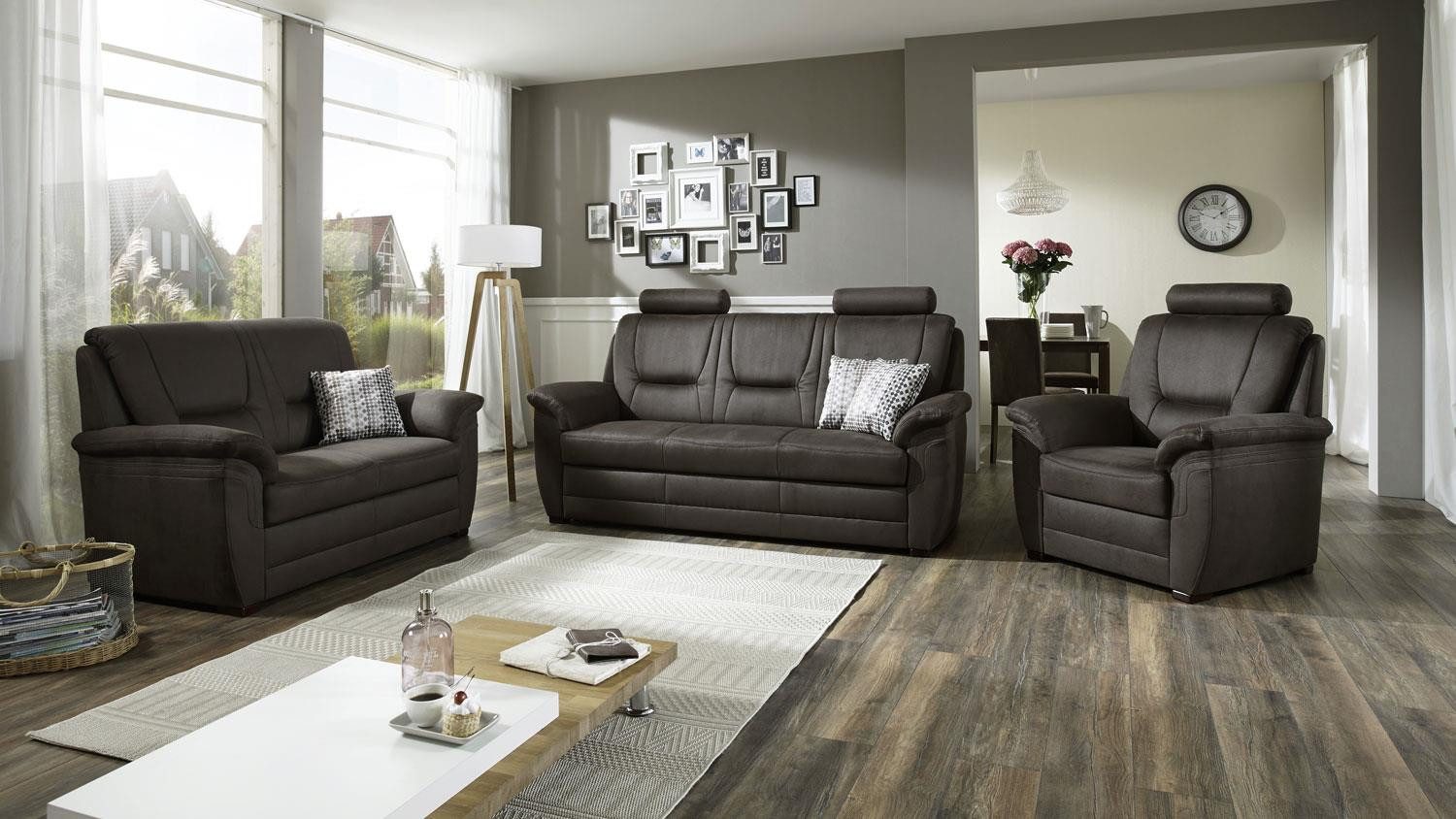 Tolle dreiteilige Sofagarnitur von Polipol in hochwertigem Stoffbezug braun, bestehend aus einem 3-Sitzer, 2-Sitzer und Sessel. Der Bonellfederkern inklusive Nosagfederung im Sitz bietet einen sehr hohen Komfort, auch bei langem Sitzen. Das einzigartige Design, die hochwertigen Materialien und das angenehme Preis-Leistungsverhältnis sind überzeugende Argumente. Впередe praktische Extras wie die Relaxfunktion, der Schubkasten oder verstellbare Kopfstützen erhalten Sie gegen Mehrpreis.