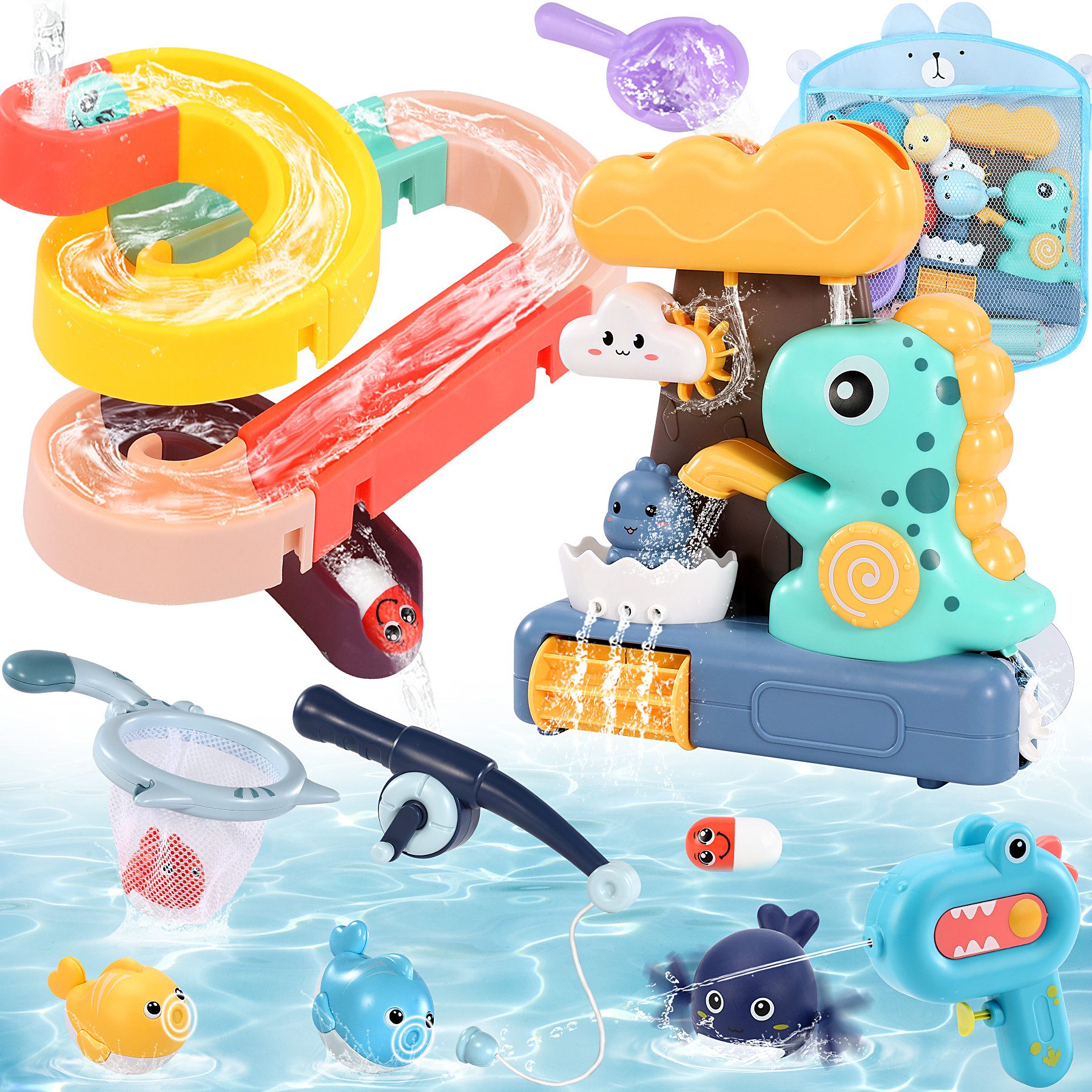 Was Sie bekommen: Dieses Badewannenspielzeug umfasst 5 beliebte Badewannenspielzeug ab 2, darunter einen Wasserfall, ein Spielzeug der Kugelbahn (einschließlich 9 Spuren, 2 Kugeln, 5 Saugnapf), Angelspiel Wasser (einschließlich einer Angelrute, ein Fischereinetz und 3 Fische ), eine Wasserpistole, ein Aufwickelwal und ein Aufbewahrung. Bringen Sie dem Bad Ihres Babys endlosen Spaß und Ihr Baby wird eine perfekte Badezeit genießen