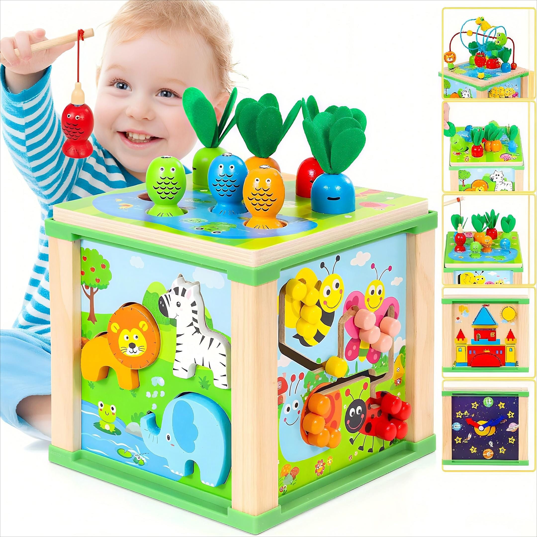 Neues und verbessertes Babyspielzeug. Dieses Aktivitätswürfel enthält 7 Spiele in einem: Motorikschleife, Insektenlabyrinth, Tierzuordnung, Formzuordnung, Karottenernte, Angelspiel, Lernuhr. Eine Vielzahl von Spielmethoden, um den unterschiedlichen Bedürfnissen von Kindern gerecht zu werden, sodass Kinder im Spiel erkunden, erleben und entdecken können.Es ist ein sehr gutes spielzeug ab 1 jahr baby