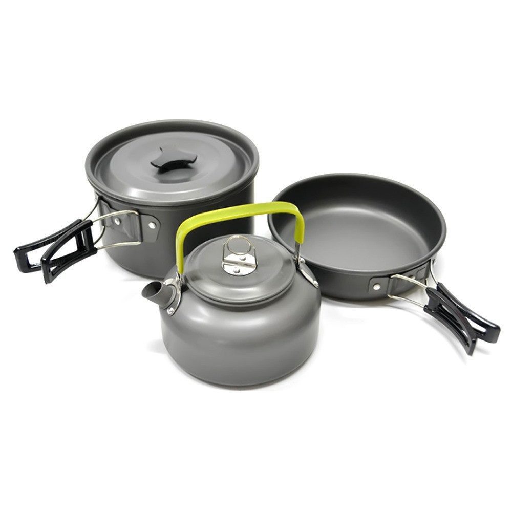 1x Teekessel mit Deckel + 1x Antihaft-Bratpfanne + 1x eloxierter Aluminiumtopf mit Deckel + 1x Tragetasche. Perfekt für Camping mit 2-3 Personen.