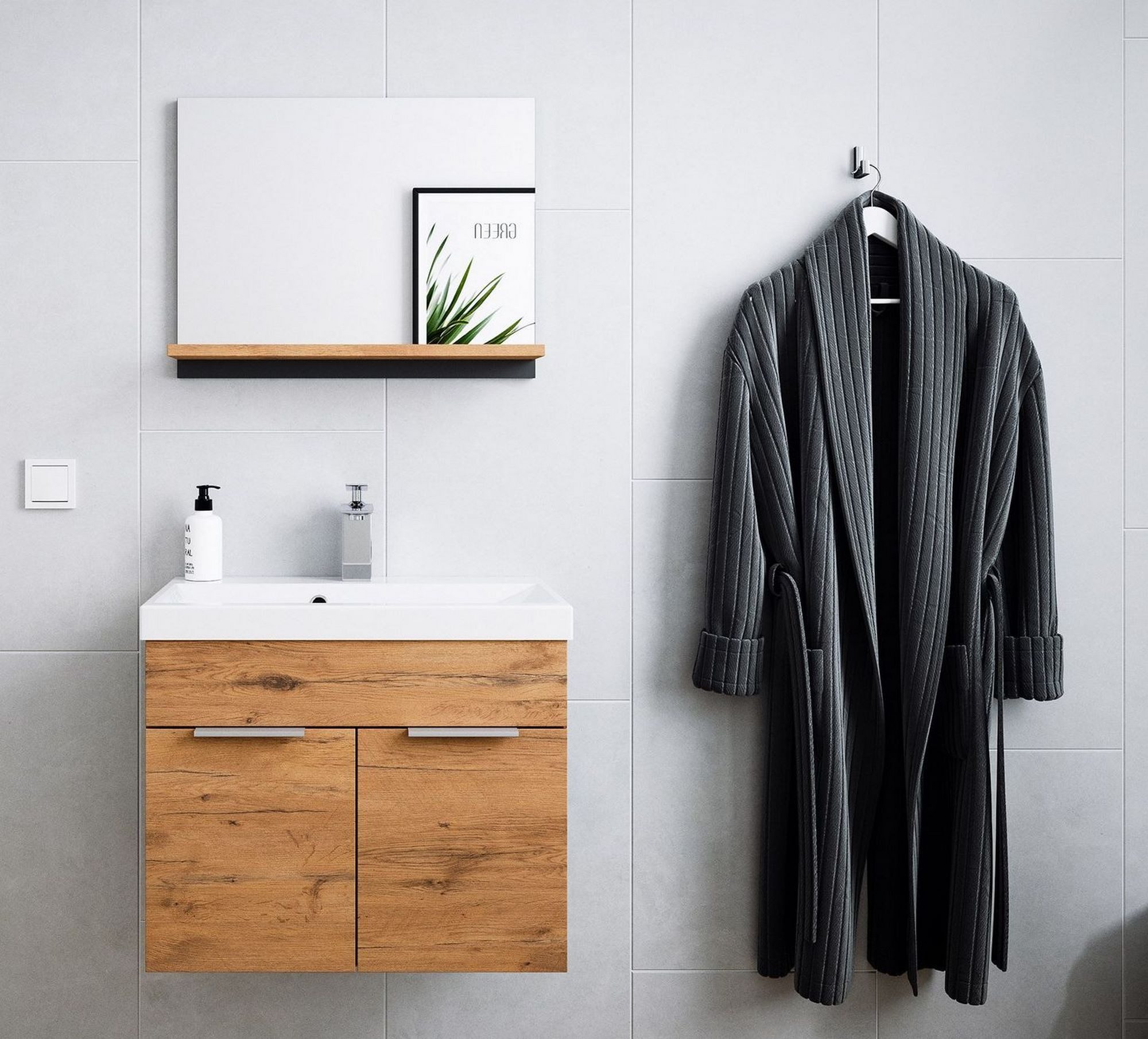 Schaffen Sie in Ihrem Badezimmer eine stilvolle Wohlfühlatmosphäre mit dem hochwertigen Badmöbelset Lago. Dieses zweiteilige Set in edler Oak/grafit matt-Kombination besteht aus einem Waschtischunterschrank mit einem Mineralguss-Waschbecken und einem modernen Spiegel mit Ablagefläche. Die sanfte Softclose-Funktion der Türen sorgt für ein geräuschloses Спрятать, während die wasserabweisenden Oberflächen einfach zu pflegen sind. Dieses Set höchste Qualität und Langlebigkeit und verwandelt Ihr Bad in eine kleine Oase der Ruhe und Ordnung.