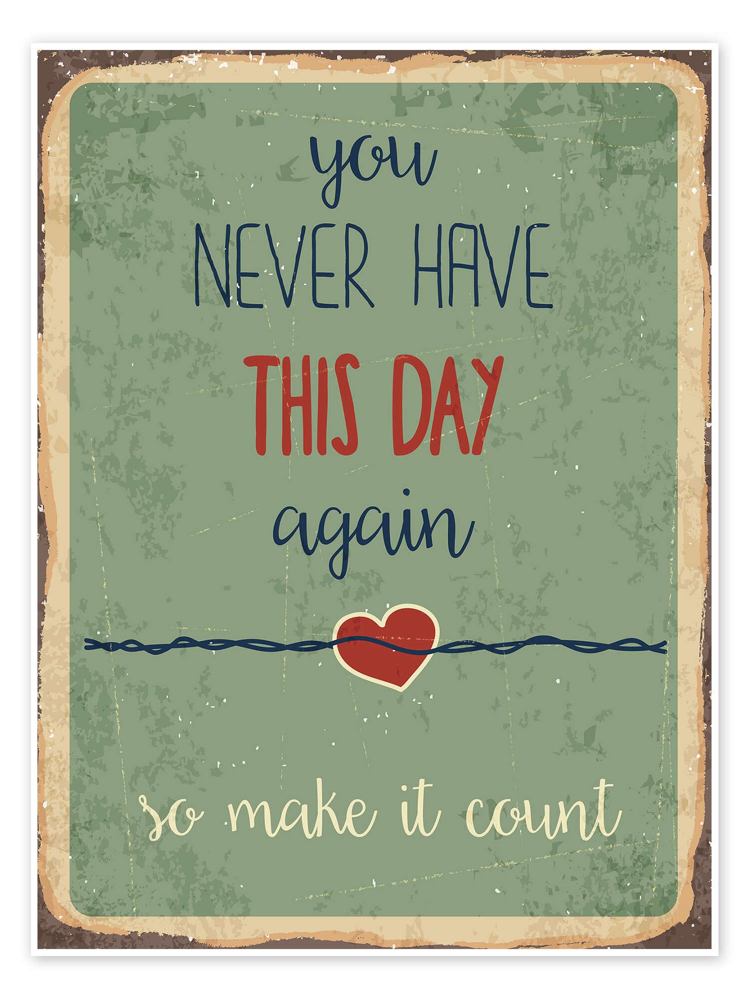 Das Poster „Dieser Tag kommt nie wieder“ (620417) aus dem Меню des Kunstverlags Posterlounge wird Sie mit intensiven Farben und hervorragender Kunstdruck-Qualität begeistern. Der hochwertige, leicht glänzende Druck auf kräftigem Premiumpapier (250 g/m²) macht das Bild von Editors Choice zu einem echten Hingucker für Ihr Zuhause. Durch den 3 mm breiten weißen Rand, der in allen Formaten inbegriffen ist, wird das Motiv hervorgehoben und wirkt besonders edel.