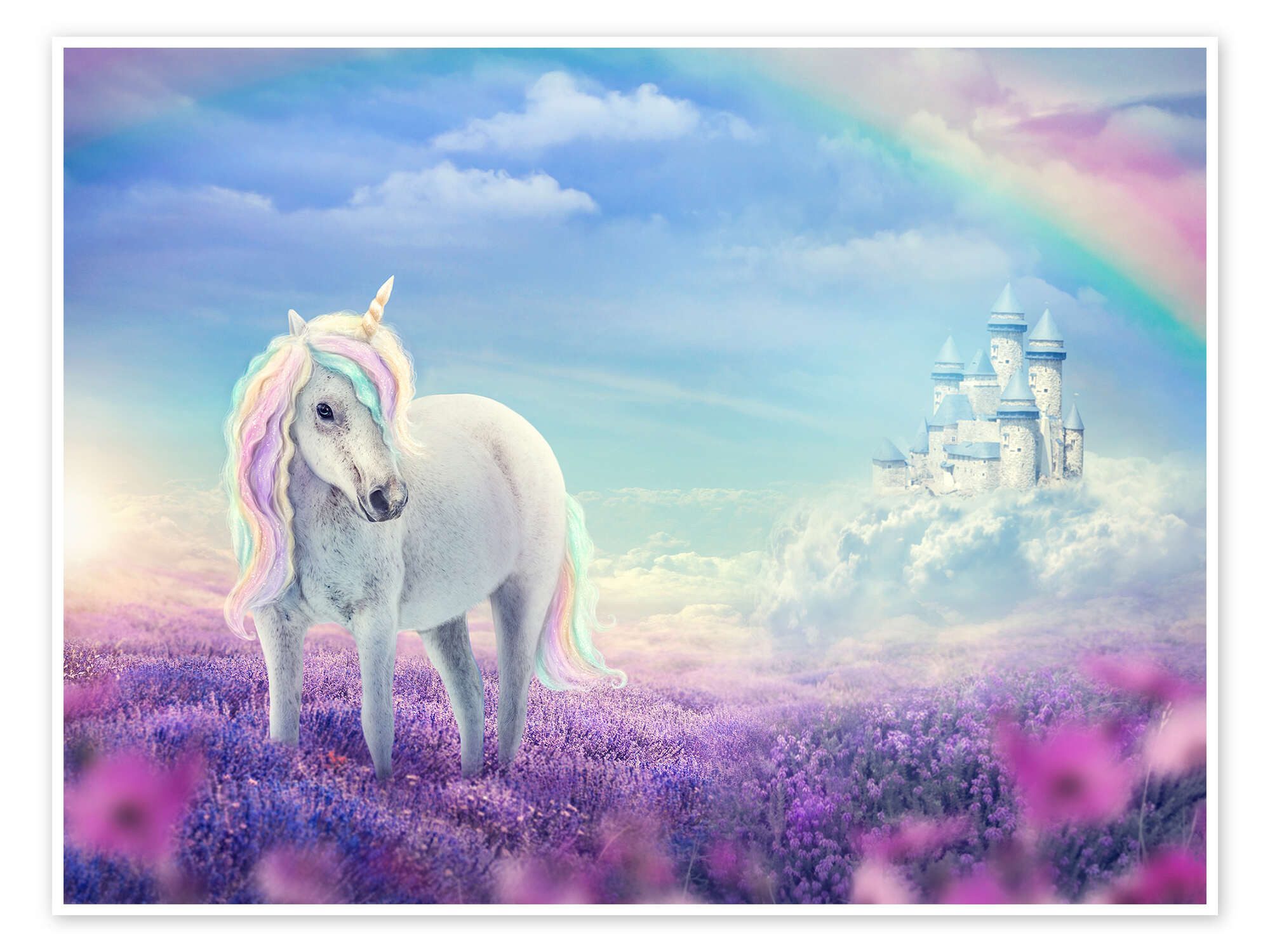 Das Poster „Weißes Einhorn auf einem Blumenfeld“ (751872) aus dem Меню des Kunstverlags Posterlounge wird Sie mit intensiven Farben und hervorragender Kunstdruck-Qualität begeistern. Der hochwertige, leicht glänzende Druck auf kräftigem Premiumpapier (250 g/m²) macht das Bild von Elena Schweitzer zu einem echten Hingucker für Ihr Zuhause. Durch den 3 mm breiten weißen Rand, der in allen Formaten inbegriffen ist, wird das Motiv hervorgehoben und wirkt besonders edel.