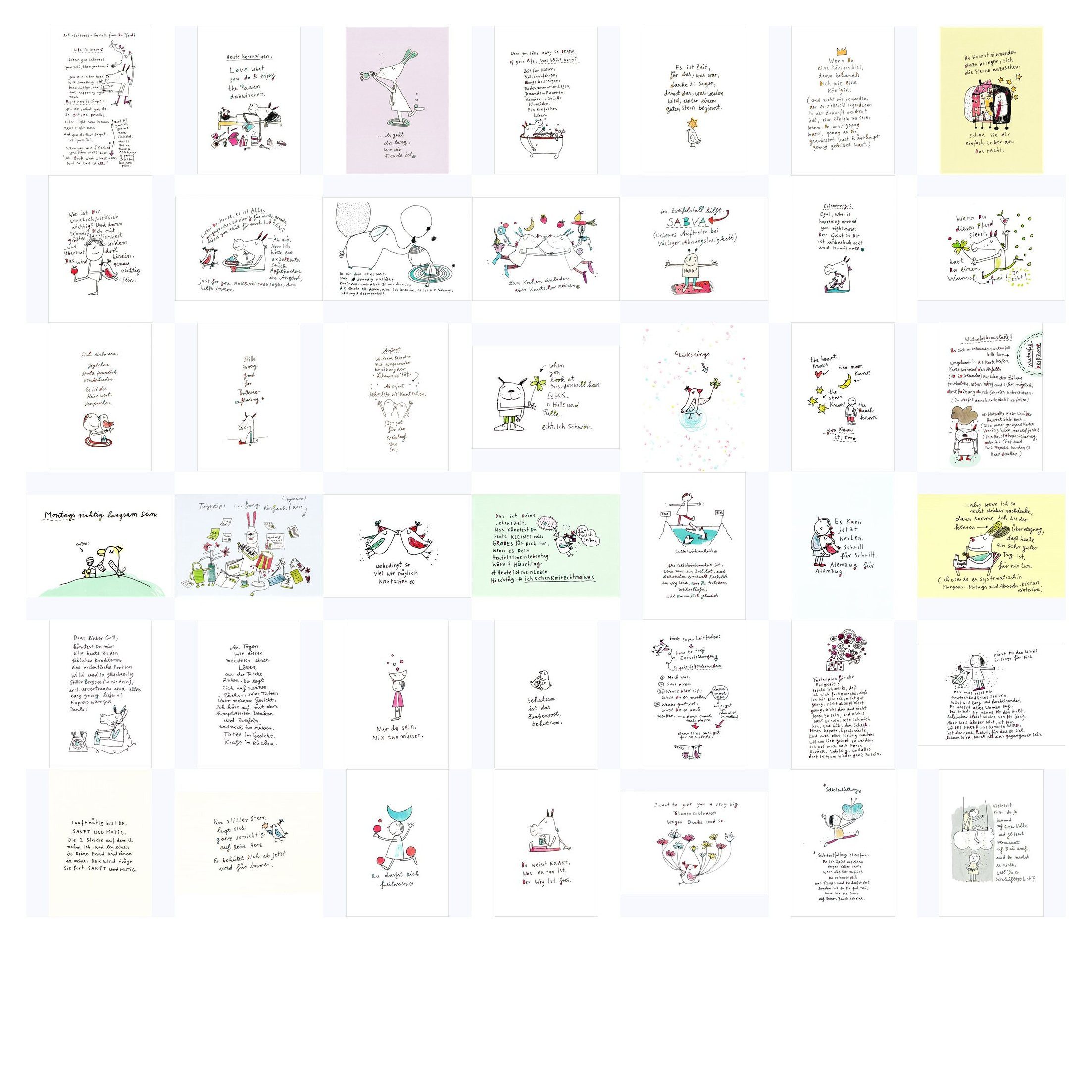 Karin Clauß, die kreative Zeichnerin und Texterin hinter unseren Karindrawings, bringt mit ihren Postkarten ihr ganzes Fühlen, Denken und Die-Welt-Sehen auf ihre eigene zauberhafte Art und Weise zu Papier. So entstehen wunderbare Postkarten, die mit viel Tiefe zum Nachdenken anregen, und gleichzeitig einen sinnlichen Humor ausstrahlen. Все Karten wurden hochwertig im Offsetdruck-Verfahren hergestellt und kommen ganz im Sinne ihrer Botschaften in schlichter matter Oberfläche daher. Perfekt zum Verschenken oder einfach zum Anschauen in besinnlichen stillen Momenten.