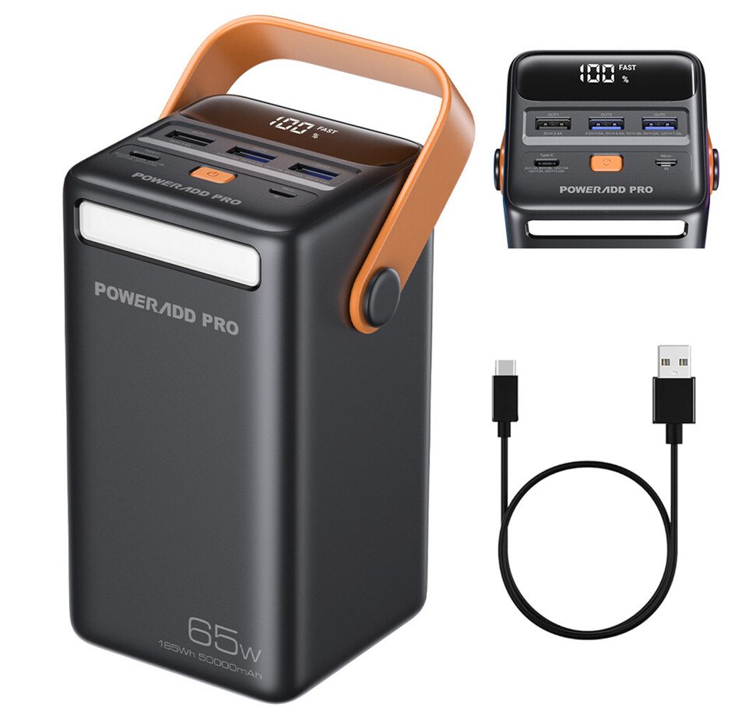 Tragbares und modernes Design: Die 50000mAh USB C Externer Akku ist mit einem tragbaren Griff ausgestattet, der einfacher zu tragen ist und bei der Verwendung im Freien keine Belastung darstellt. Ausgestattet mit einer superhellen Taschenlampe ist dieses tragbare Ladegerät der perfekte Partner für Ihre nächtlichen Ausflüge im Freien, zum Lesen und für Notfälle.